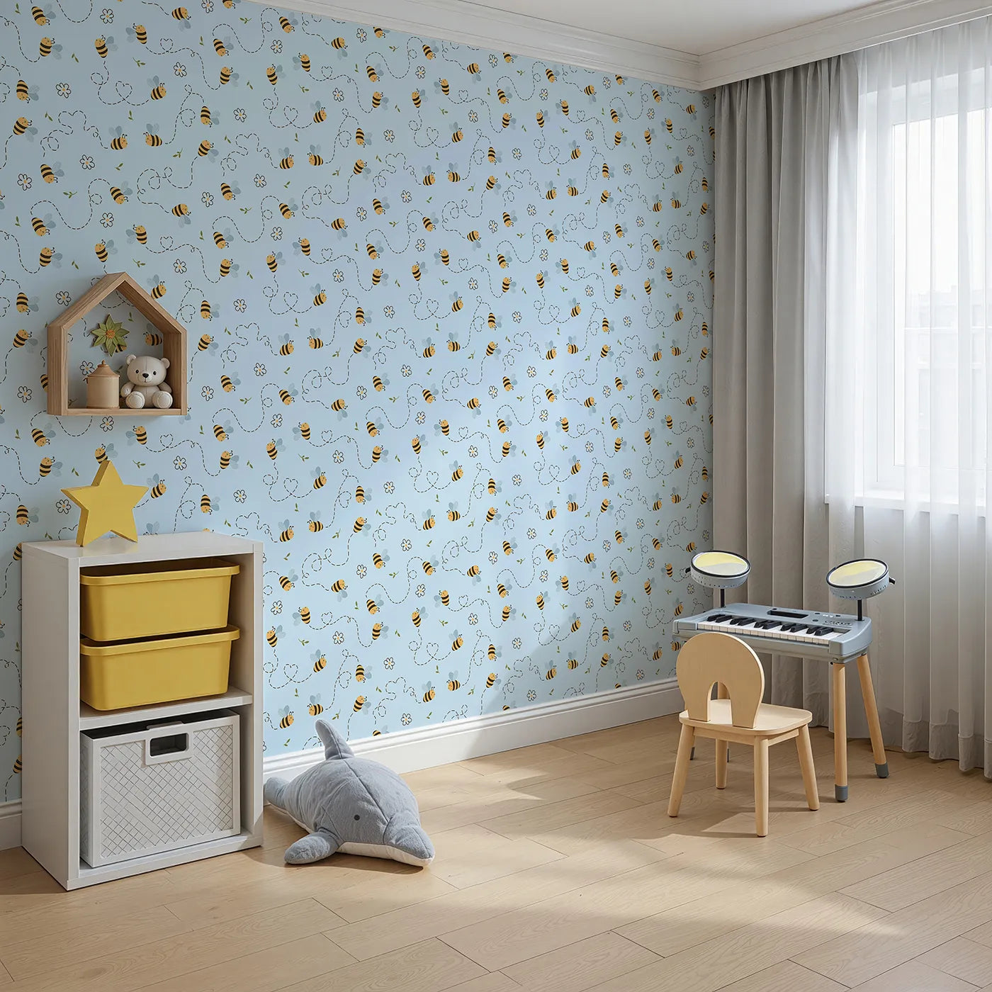 This charming animal wallpaper is buzzing with fun! It features a sweet pattern of happy bees flying along dotted paths, with little flowers and leaves scattered about. The clean, simple illustrations on a sky blue background create a cheerful and bright atmosphere, perfect for a sunny playroom or nursery.