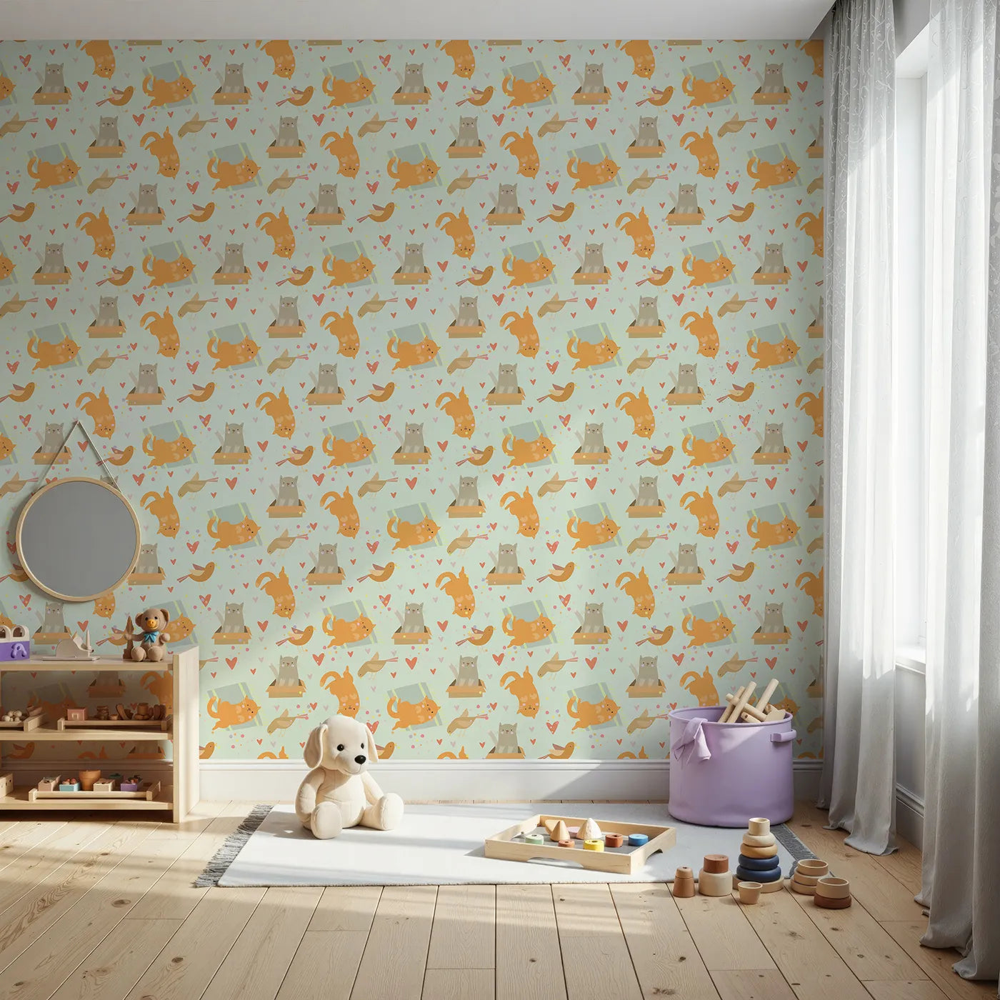 This charming kids wallpaper features a fun pattern of playful cats, some napping on rugs and others popping out of boxes, alongside their sweet bird friends. Set against a fresh mint green background with hearts and confetti, this design creates a joyful and imaginative scene perfect for a nursery or playroom.