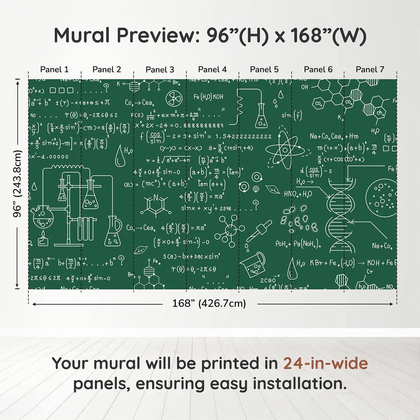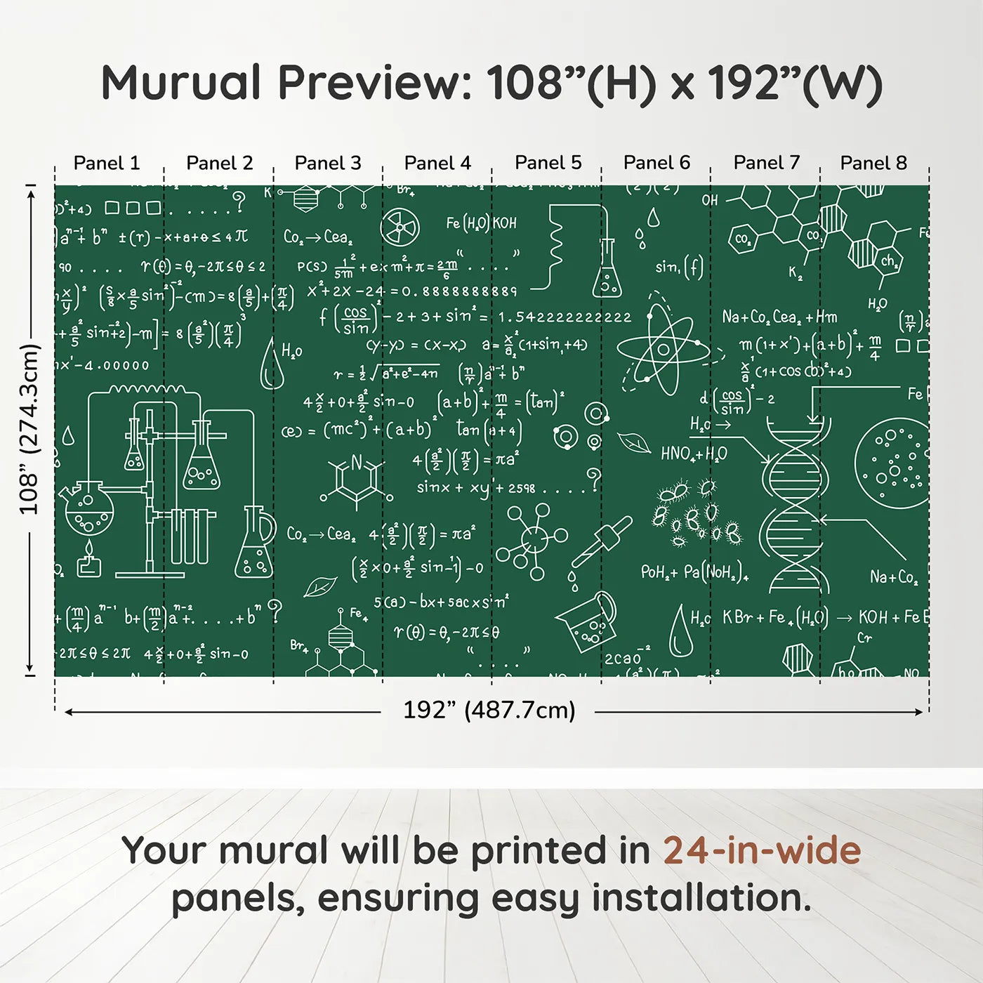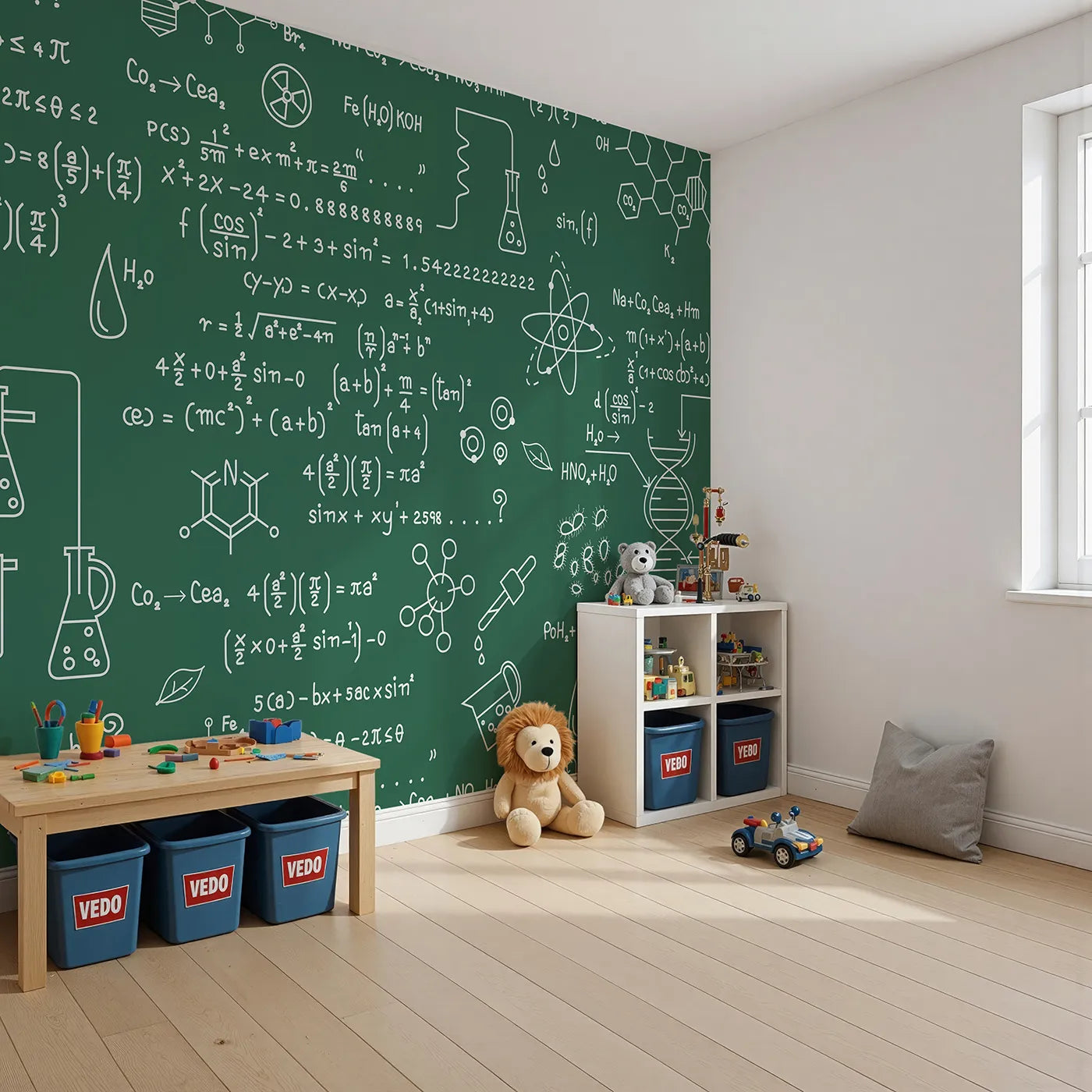 This smart and stylish wall mural features a pattern of chemistry equipment and formulas on a classic green chalkboard background. It's the perfect choice for a big kid's room, study space, or a STEM-themed playroom, making science look cool and creative.