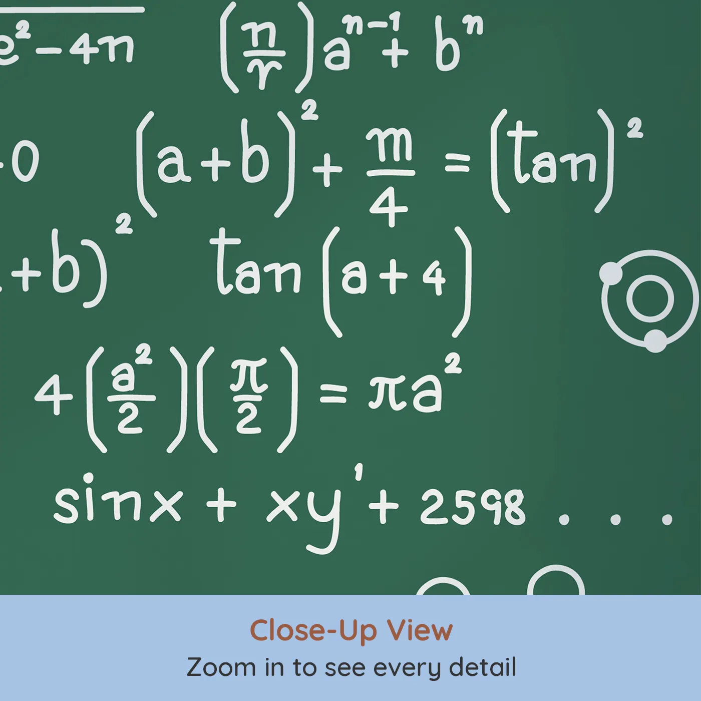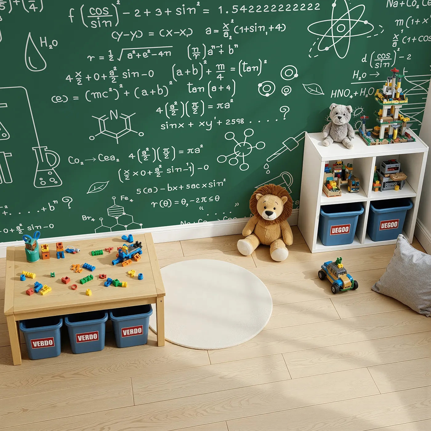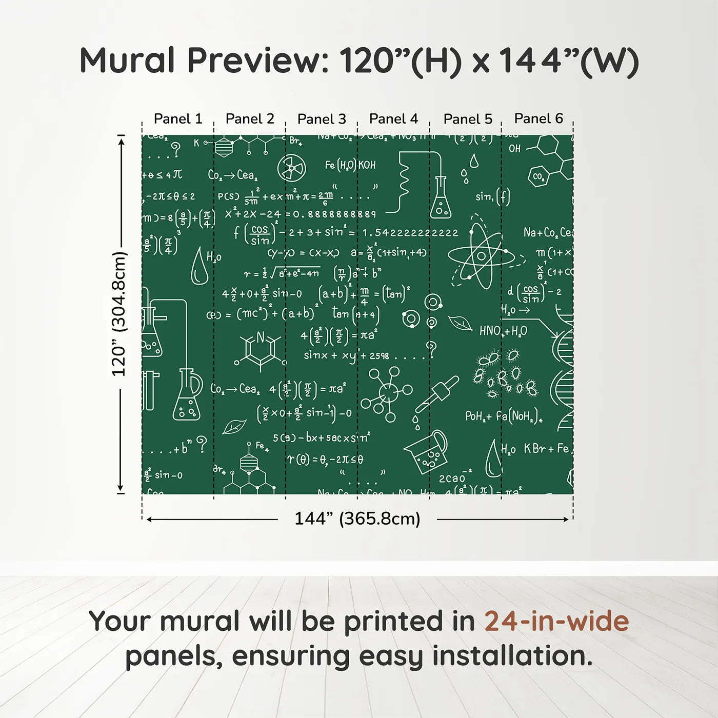 This smart and stylish wall mural features a pattern of chemistry equipment and formulas on a classic green chalkboard background. It's the perfect choice for a big kid's room, study space, or a STEM-themed playroom, making science look cool and creative.