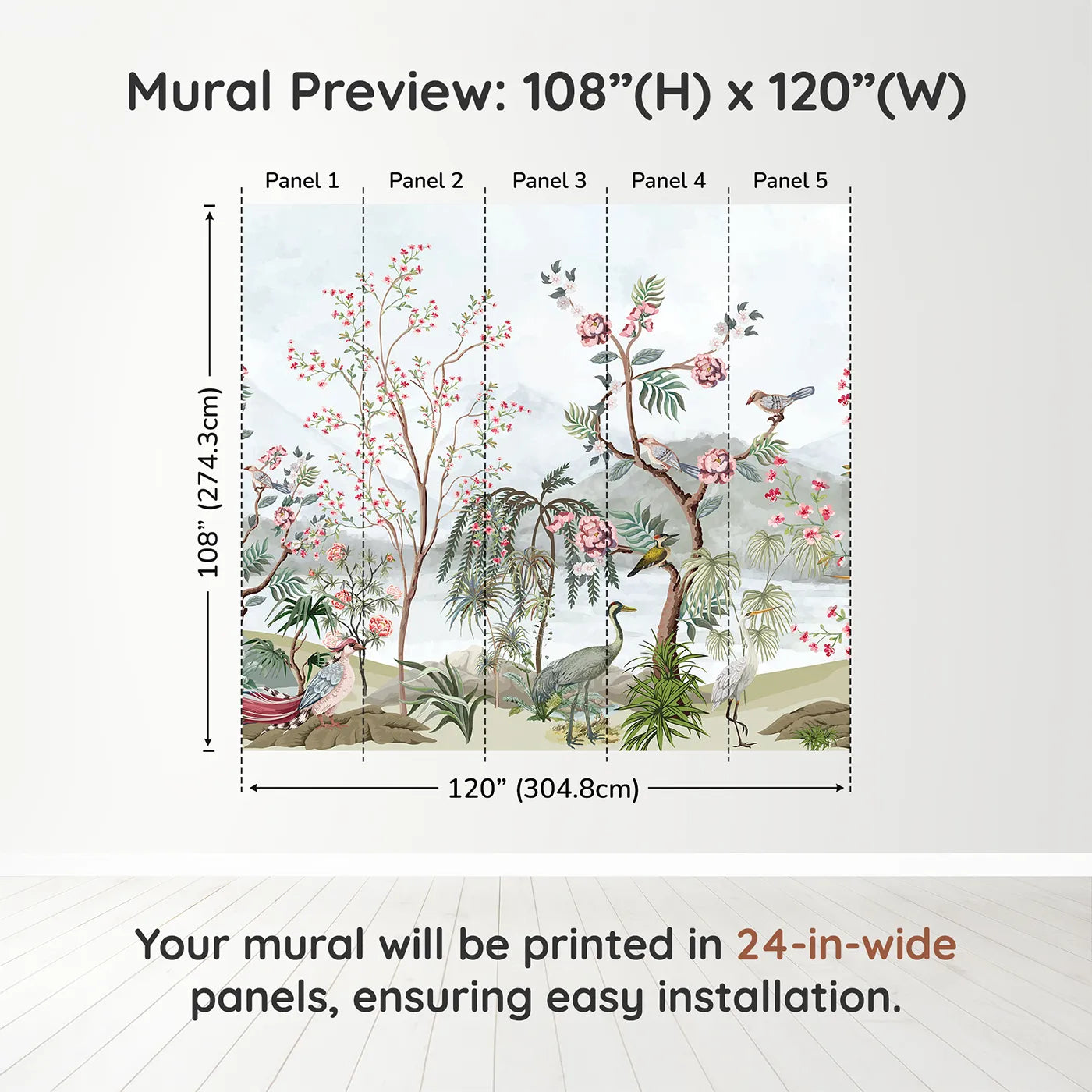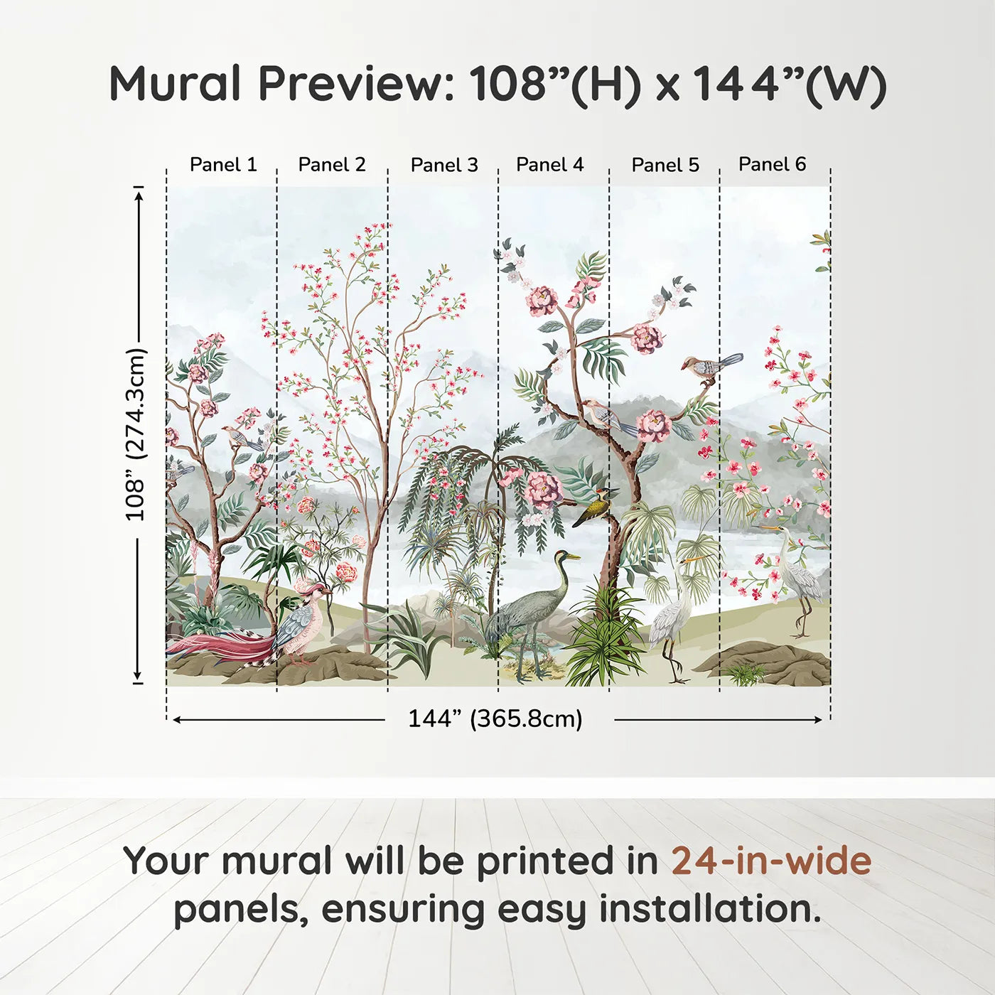 This beautiful wall mural features a classic Chinoiserie garden scene with exotic birds and flowering trees. In the background, misty mountains rise, adding a sense of depth and serenity to the elegant design. Itβs a sophisticated and calming piece for a timeless nursery.