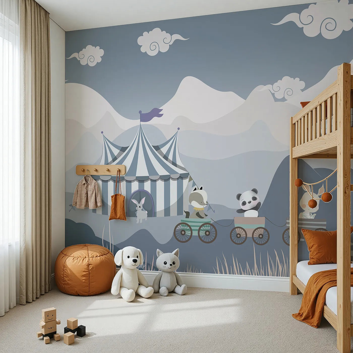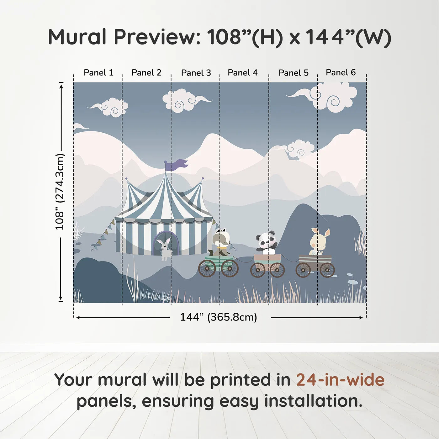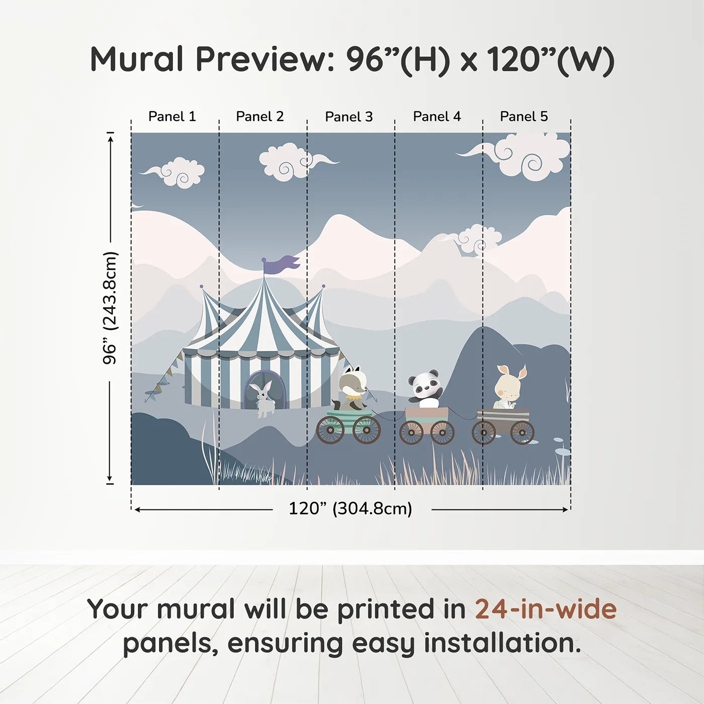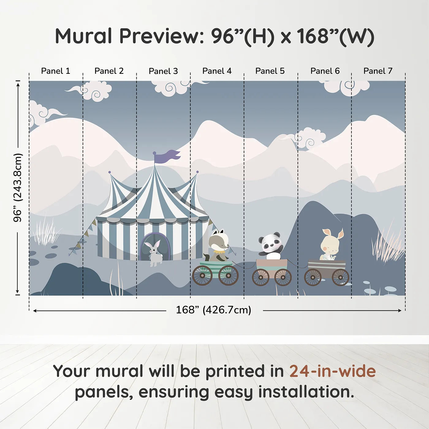 This charming wall mural is full of gentle fun! A cute panda, badger, and rabbit ride a little train through a calm, mountainous landscape towards a blue and white circus tent. The soft, muted colors and simple style create a peaceful and imaginative scene for a nursery.