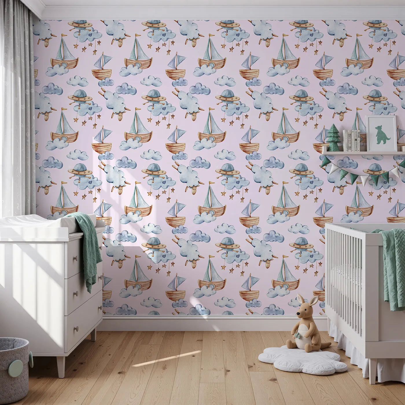This sweet girls wallpaper features a playful collection of watercolor sailboats, sleepy sheep, and spaceships drifting on a warm, blush pink sky with fluffy clouds. The whimsical illustrations create a charming and imaginative space for dreaming up grand adventures.