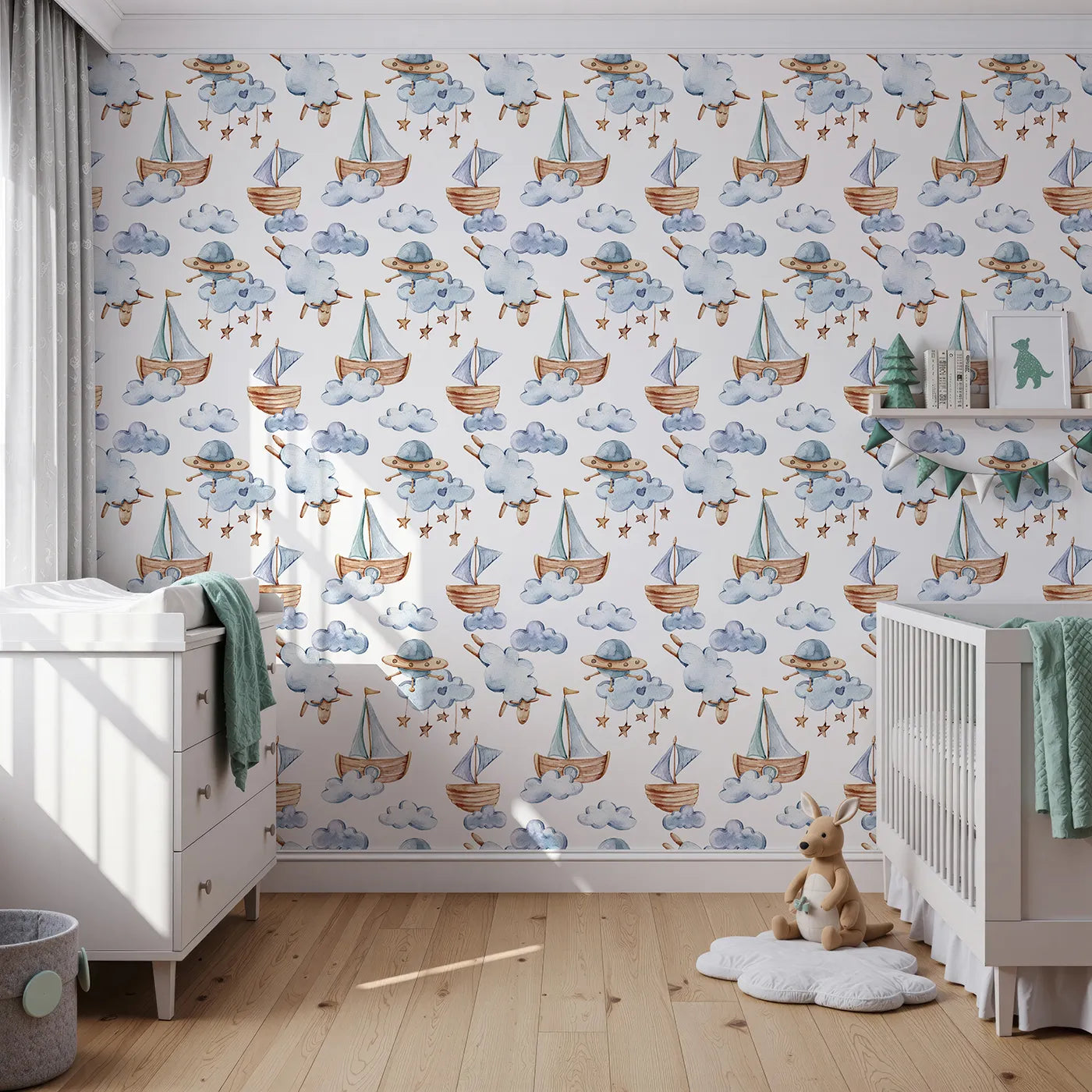This charming kids wallpaper is filled with imaginative details! It features whimsical sailboats, sleepy sheep, and friendly spaceships floating among fluffy clouds and stars. The watercolor design on a clean white background creates an airy and playful scene perfect for a nursery.