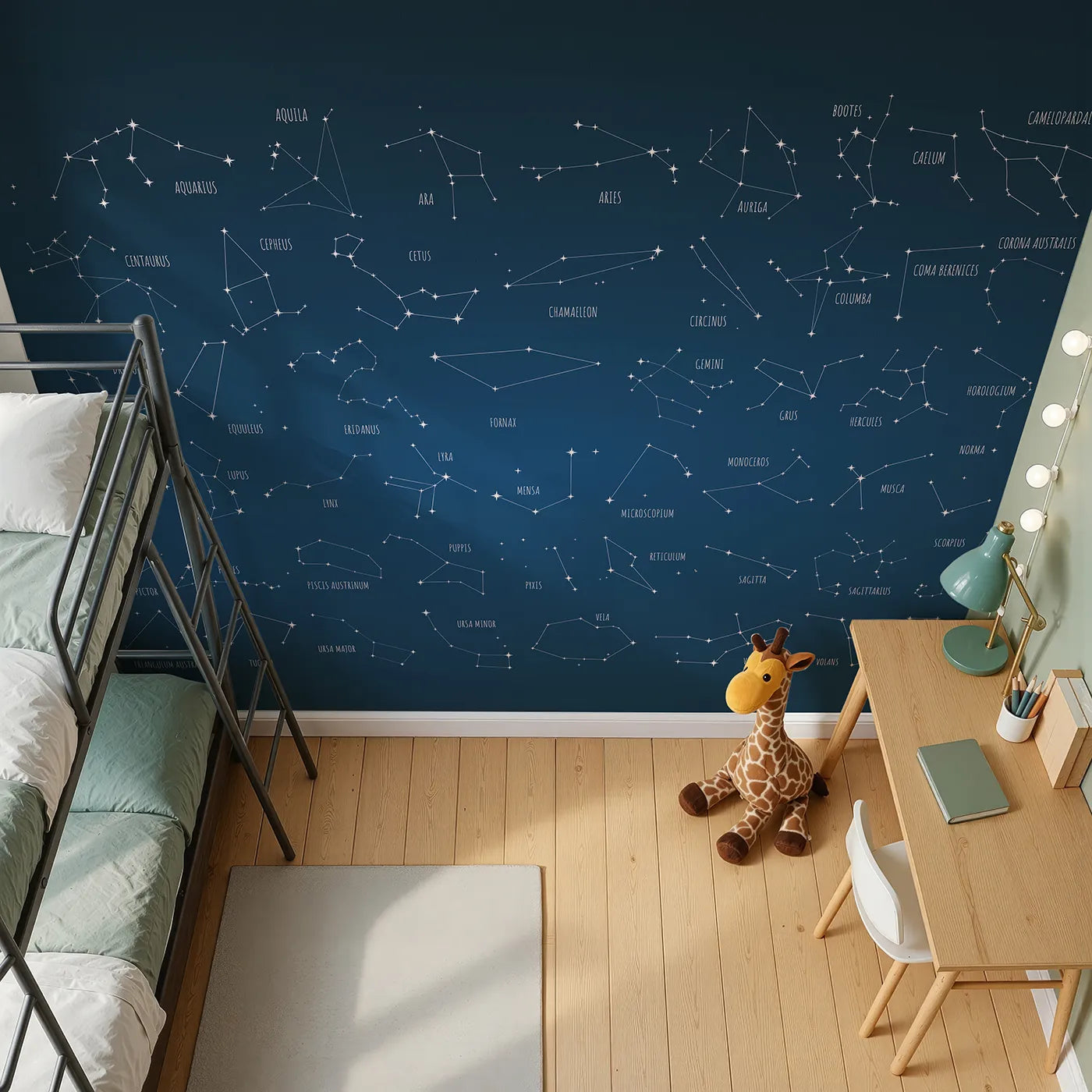 This sophisticated and educational space wallpaper features a detailed chart of the constellations of the zodiac and beyond. The classic blue and white design is both beautiful and informative, perfect for inspiring a lifelong love of astronomy in a child's bedroom or study area.