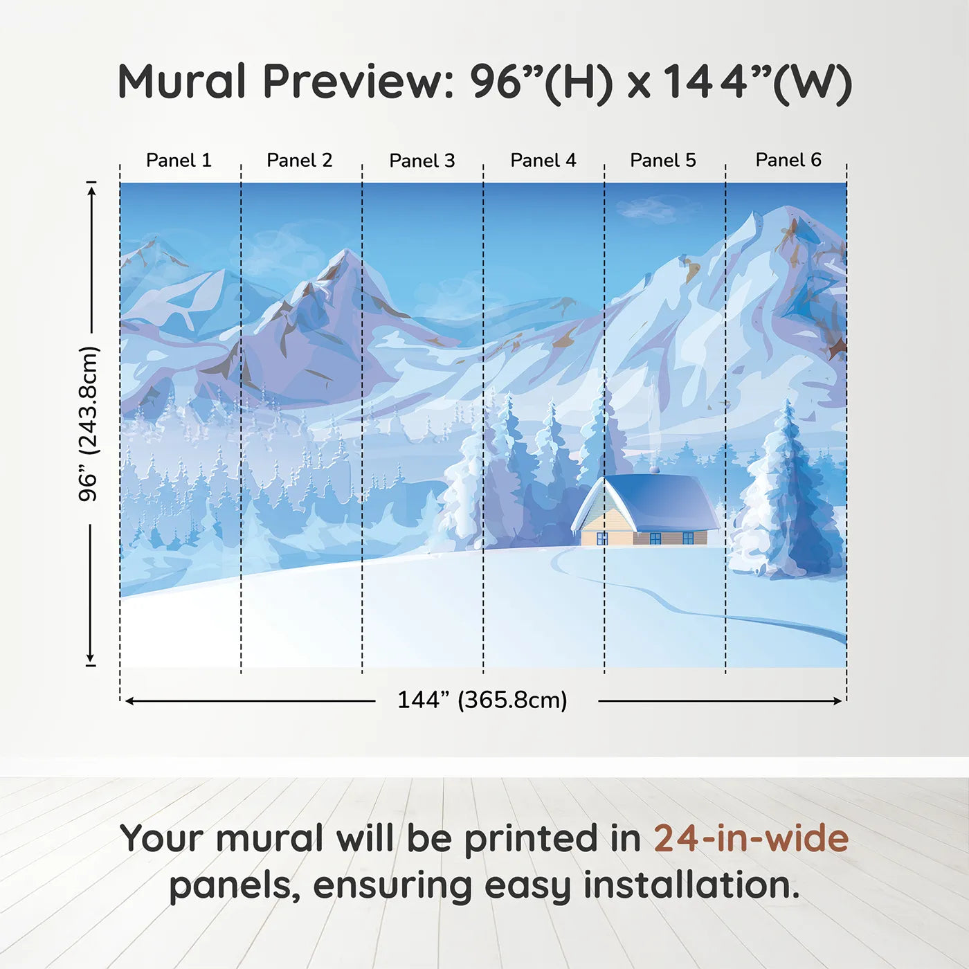 Set a scene of peaceful winter wonder with this scenic wall mural. A cozy little cabin sits nestled among snow-covered pines, with majestic, frosty mountains rising in the background under a crisp blue sky. This beautiful mountain wallpaper brings a feeling of calm and warmth to a child's bedroom or playroom.