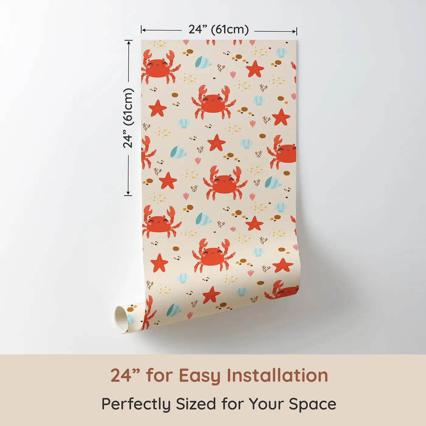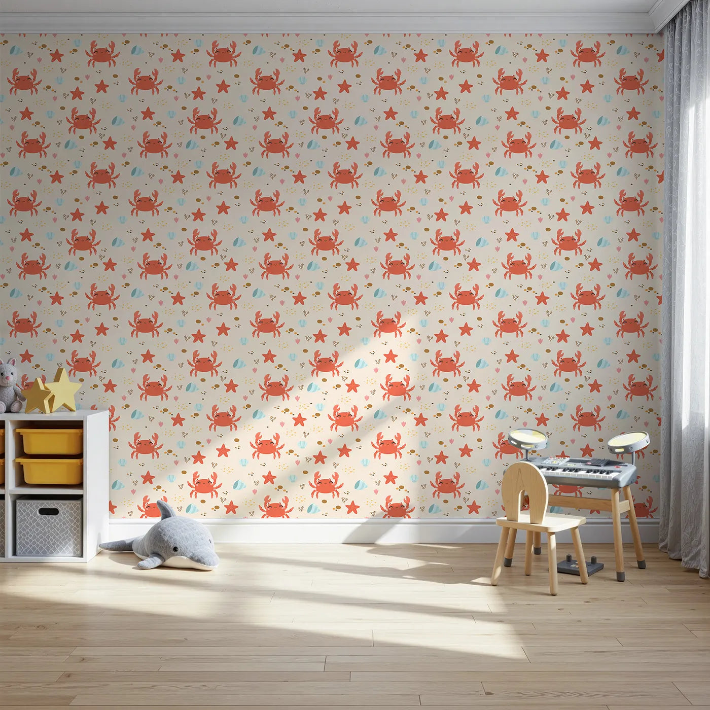 Bring the fun of a beach day to their room with our charming ocean wallpaper. This cute design features smiling red crabs, starfish, and colorful seashells scattered like treasures on a warm sand background. It's a sweet pattern for a nautical-themed nursery or bathroom.