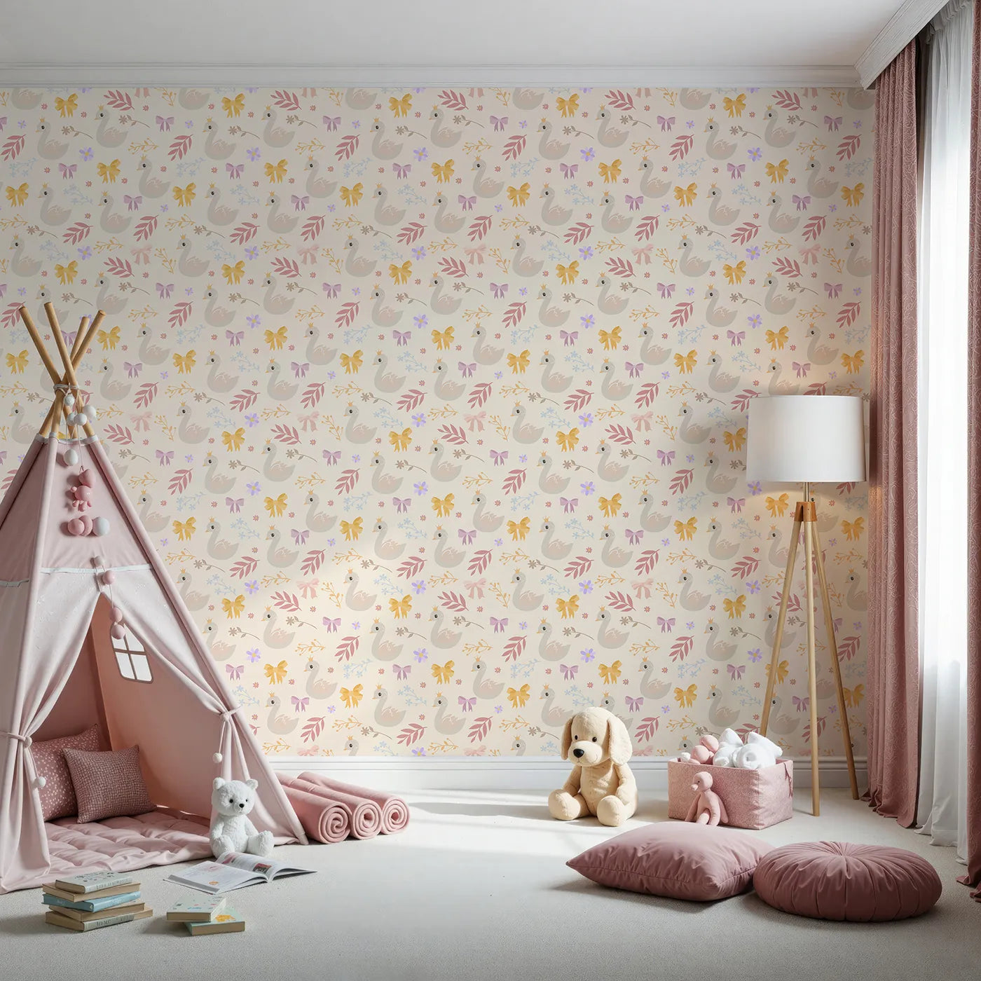 This charming nursery wallpaper features sweet, crowned swans swimming among a sprinkle of colorful bows, leaves, and flowers. The gentle pattern on a warm beige background creates a cozy and enchanting atmosphere, perfect for a dreamy, gender-neutral nursery or a whimsical playroom that will delight for years to come.