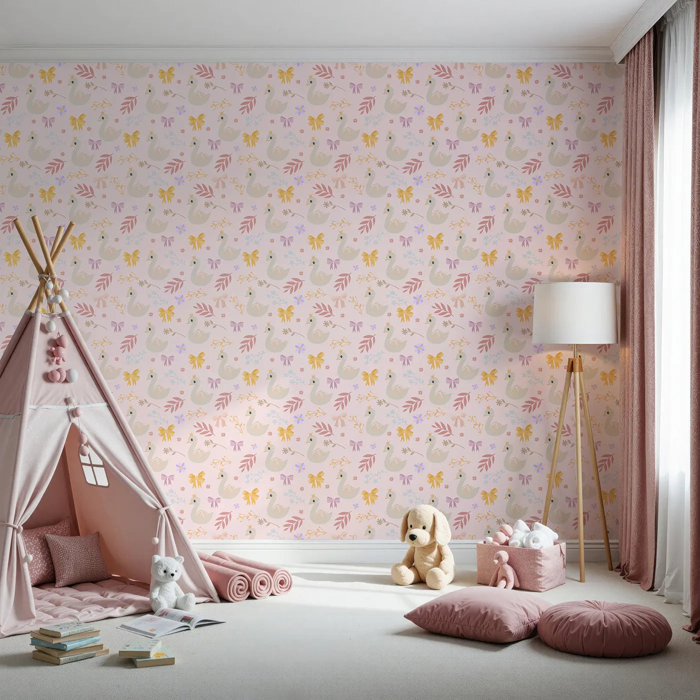 This charming girls wallpaper features sweet, crowned swans swimming among a sprinkle of colorful bows, leaves, and flowers. The gentle pattern on a soft blush pink background creates a warm and enchanting atmosphere, perfect for a dreamy nursery or a whimsical playroom that will delight for years to come.