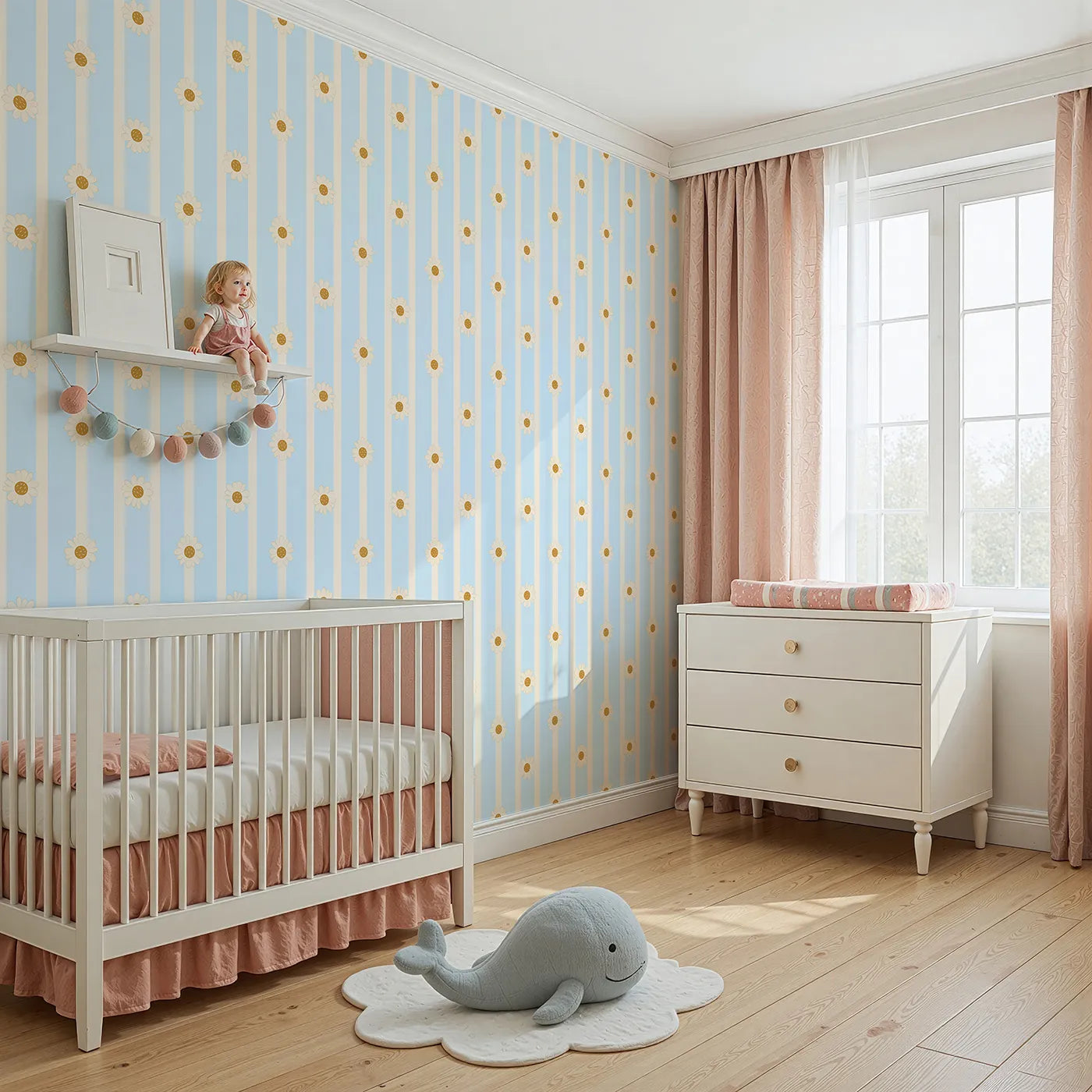 This charming kids wallpaper brings together classic blue and cream stripes with the simple joy of scattered daisies. The cool, calming blue creates a serene backdrop, while the whimsical flowers add a touch of imaginative fun. It's a perfect choice for a modern nursery, toddler room, or playroom.