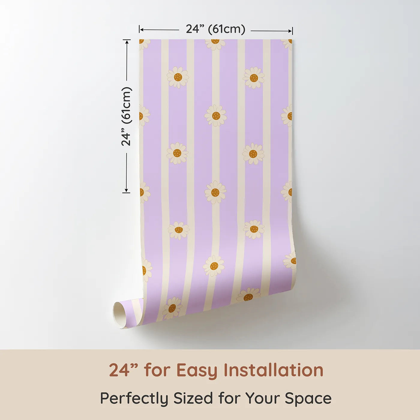 This enchanting wallpaper features simple, sweet daisies scattered over a lovely pattern of lavender and cream stripes. The soft purple hue is wonderfully calming, making it a perfect choice for a nursery or a quiet reading corner. The design is both modern and timeless, ready to grow with your child.