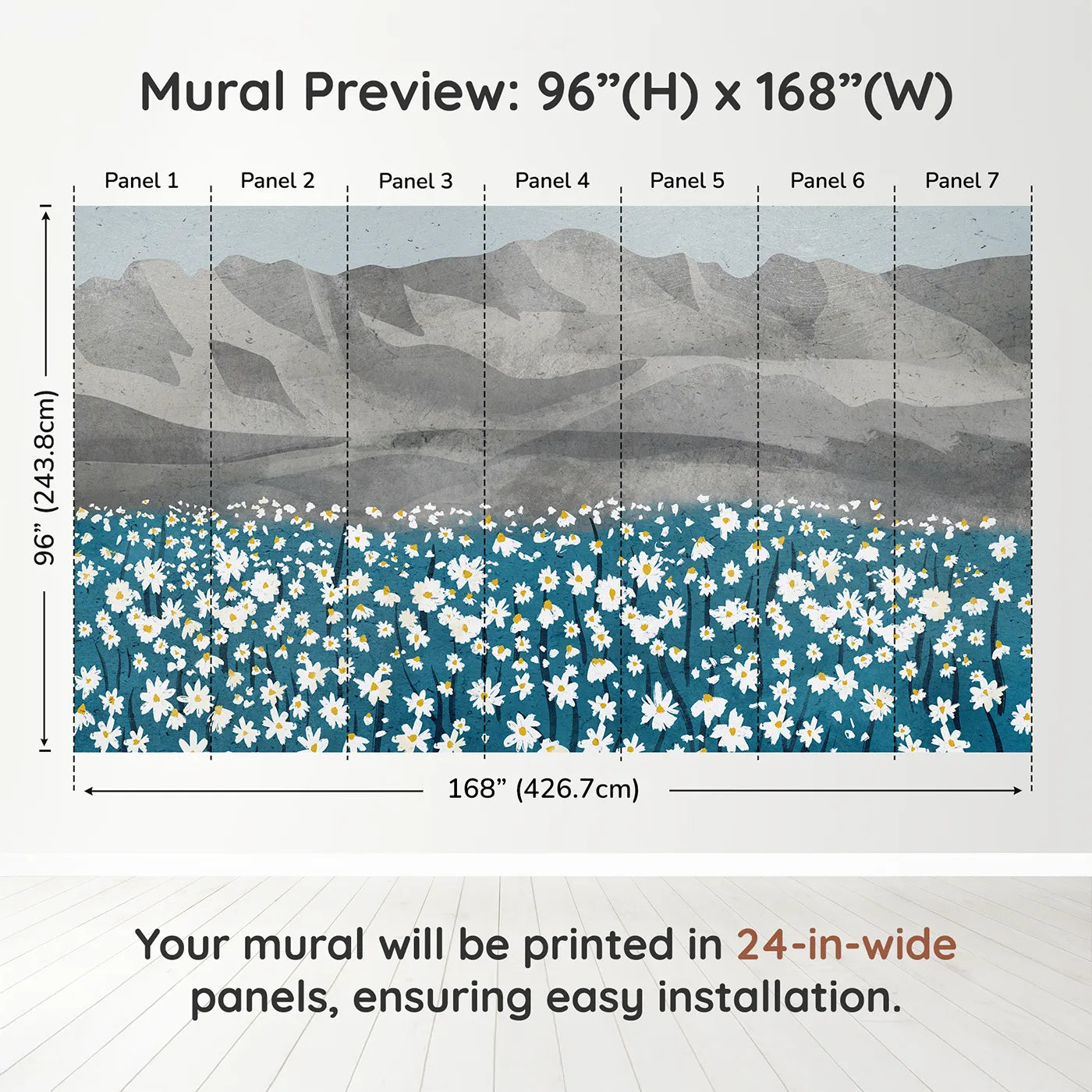 This beautiful floral wall mural features a vibrant field of white and yellow daisies against a backdrop of gray, textured mountains. The bold, graphic style is modern and cheerful, creating an artistic and joyful atmosphere perfect for a child's room or playroom.