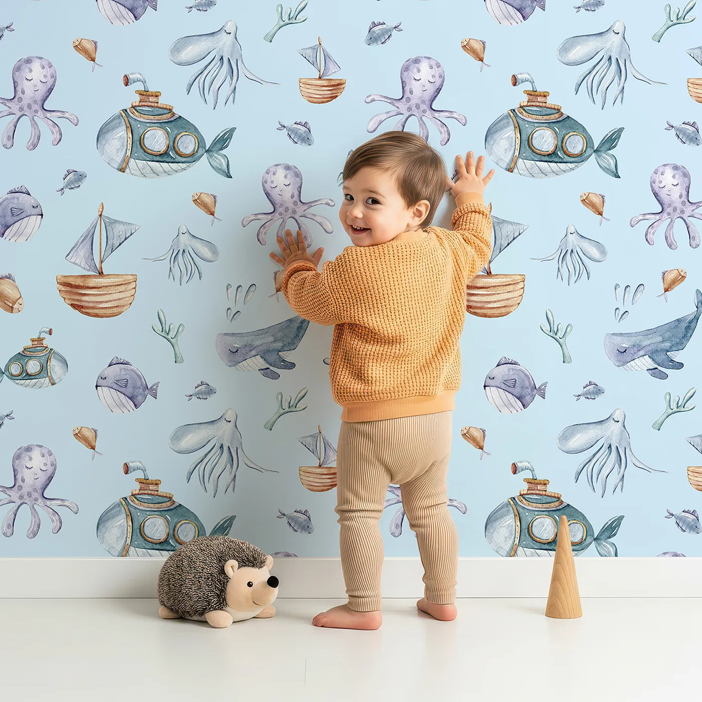 This charming ocean wallpaper is filled with sweet, sleepy sea creatures. Gentle whales, octopuses, and friendly fish swim alongside cute submarines and sailboats in a soft watercolor style. Against a blue background, this design creates a calm and imaginative underwater scene.