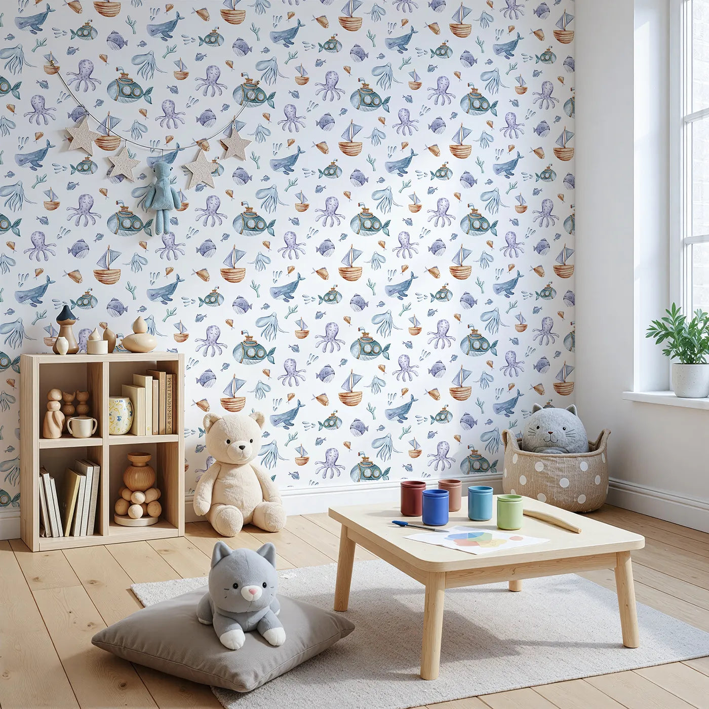 This charming ocean wallpaper is filled with sweet, sleepy sea creatures. Gentle whales, octopuses, and friendly fish swim alongside cute submarines and sailboats in a soft watercolor style. Against a clean white background, this design creates a calm and imaginative underwater scene.