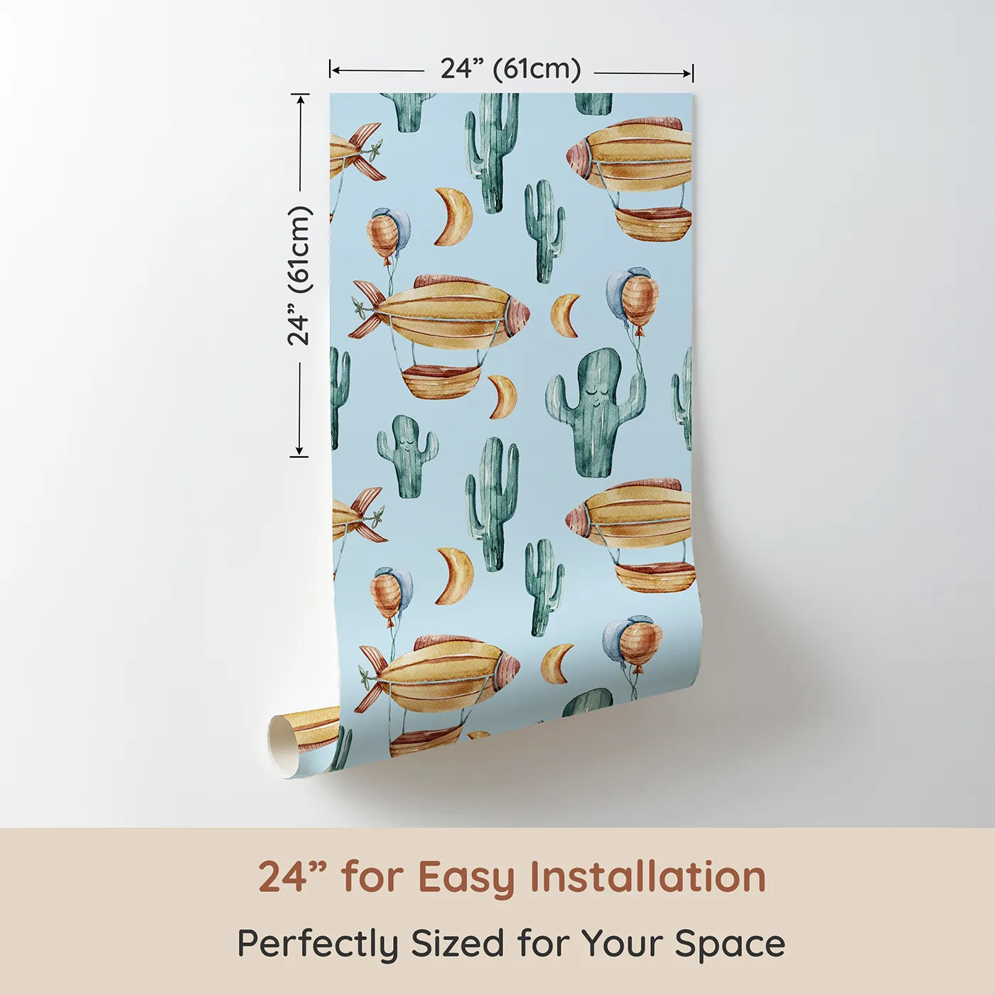 Let their imagination soar with this whimsical wallpaper. Charming watercolor airships and smiling cacti travel through a sky-blue world with golden crescent moons. This design is perfect for a child's room, creating a playful and adventurous atmosphere for your little explorer.