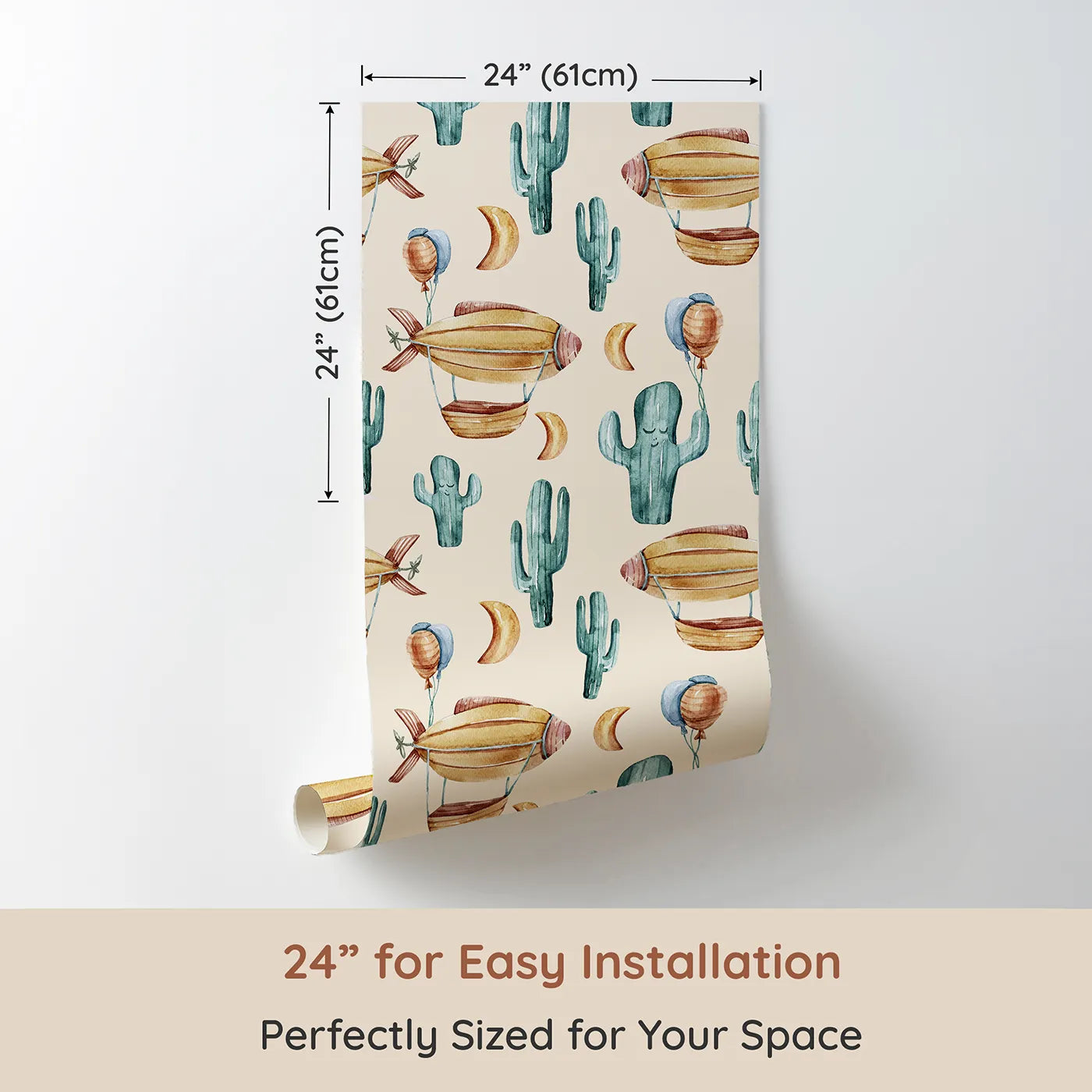 Create a cozy and playful backdrop with our imaginative Desert Balloon Voyage wallpaper. Whimsical watercolor airships and smiling cacti float across a warm cream sky dotted with crescent moons. This gender-neutral wallpaper is perfect for sparking bedtime stories of adventure.