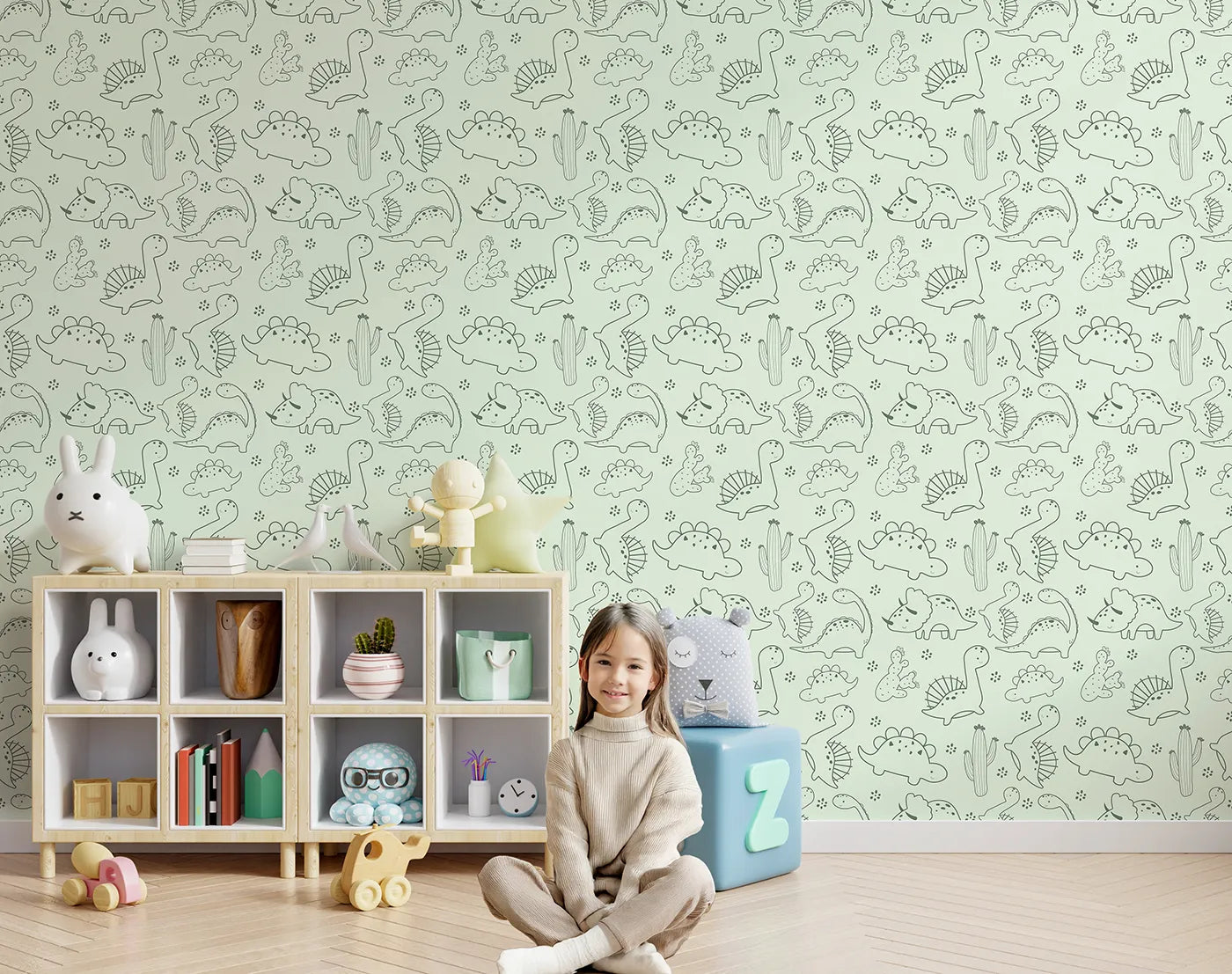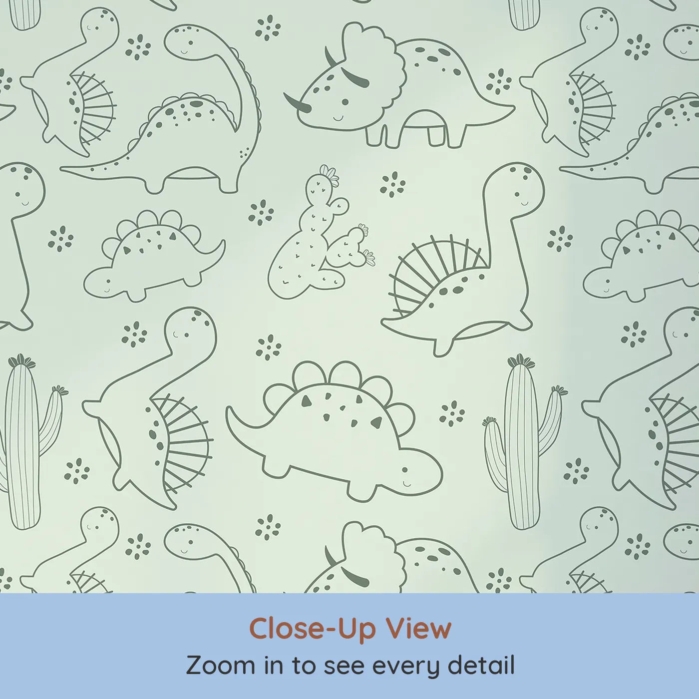 This fun kids wallpaper features a pattern of cute dinosaurs among colorful cacti on a refreshing sage green background. The bright and happy design is perfect for a gender-neutral nursery or a playful toddler room, creating a space that feels both lively and connected to nature.
