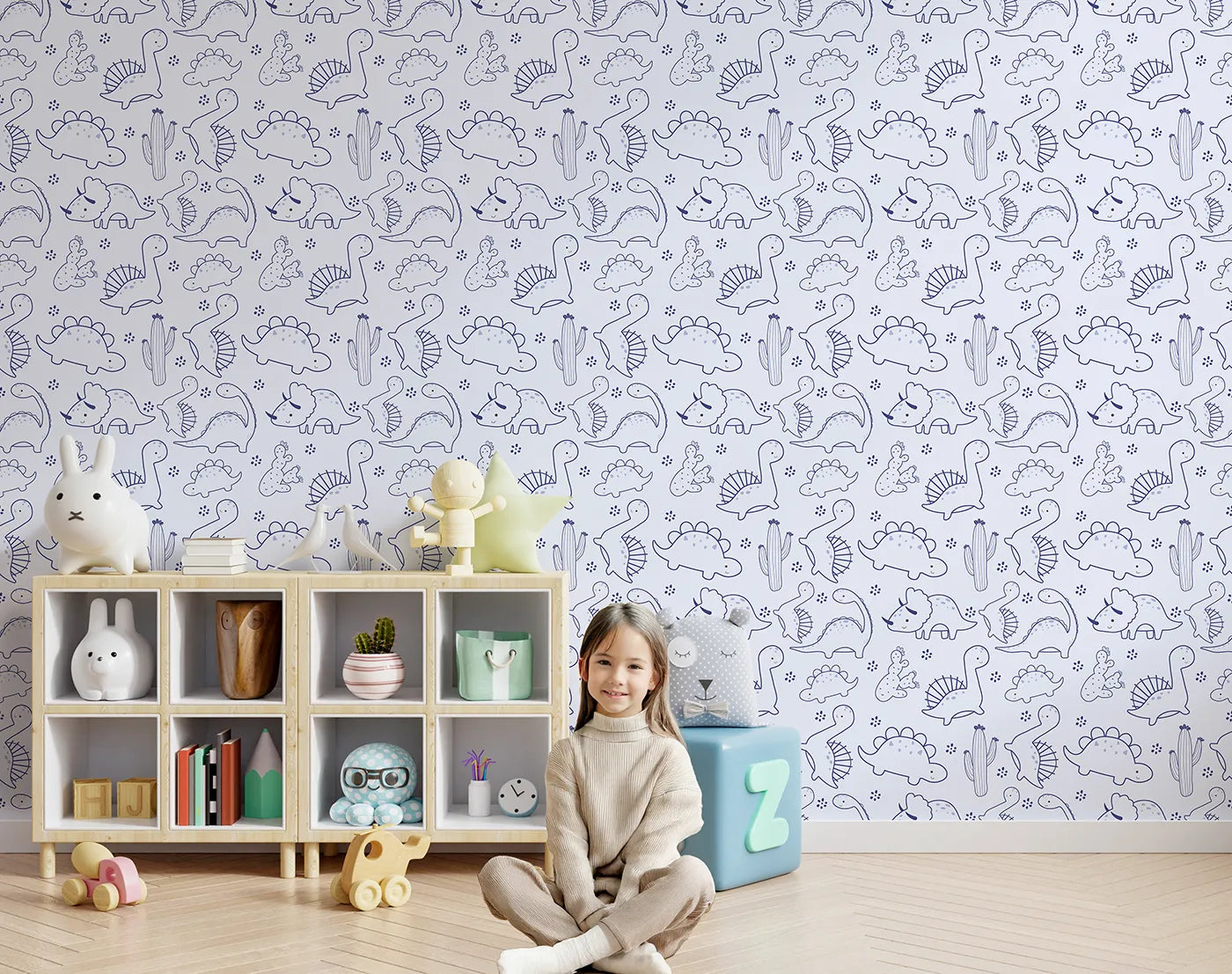 This charming boys wallpaper features a pattern of sweet dinosaurs roaming through a desert of colorful cacti, all set against a beautiful sky blue background. The classic and cheerful design is perfect for a nursery or bedroom, inspiring thoughts of sunny days and outdoor adventures.