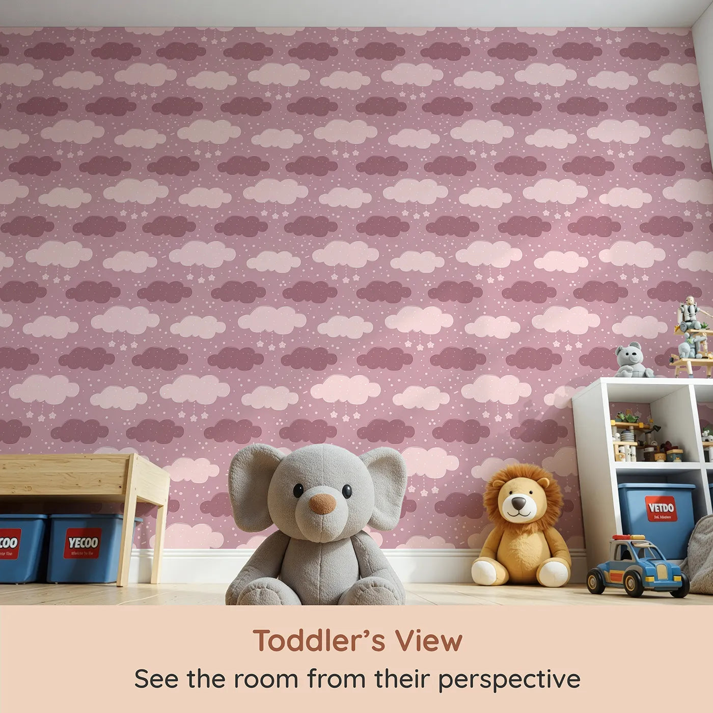Create a serene and airy atmosphere with this charming nursery wallpaper. Soft, fluffy clouds in shades of pink float gently across the wall, with tiny stars dangling below like gentle raindrops. It's a modern and minimalist design that brings a sense of peace and wonder to a baby's room or quiet play corner.