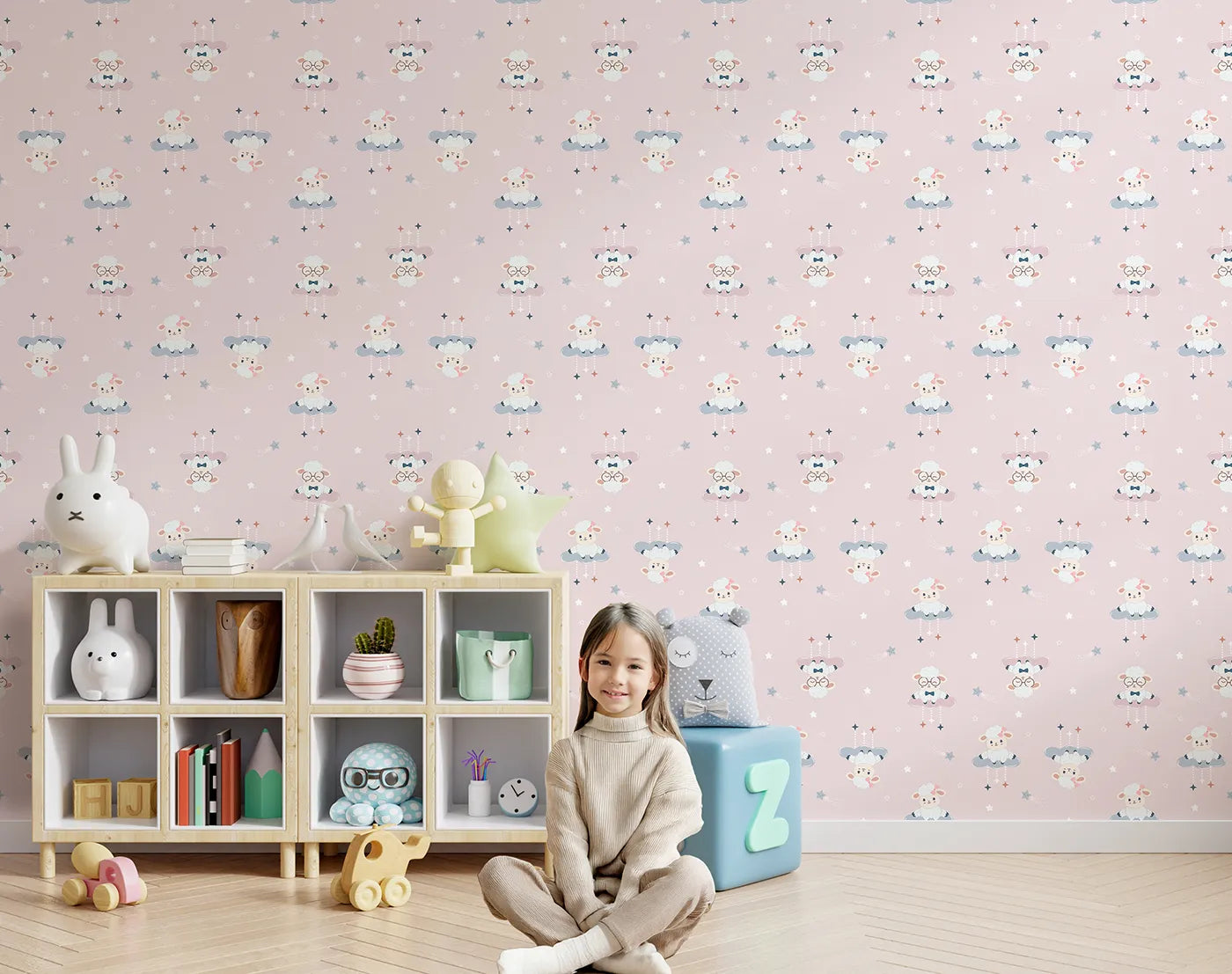 This charming nursery wallpaper is designed to create a peaceful and serene atmosphere. It features adorable, sleepy lambs floating down like raindrops from soft clouds, all in a beautiful watercolor style. The gentle colors on a blush pink background are perfect for a calm nursery.