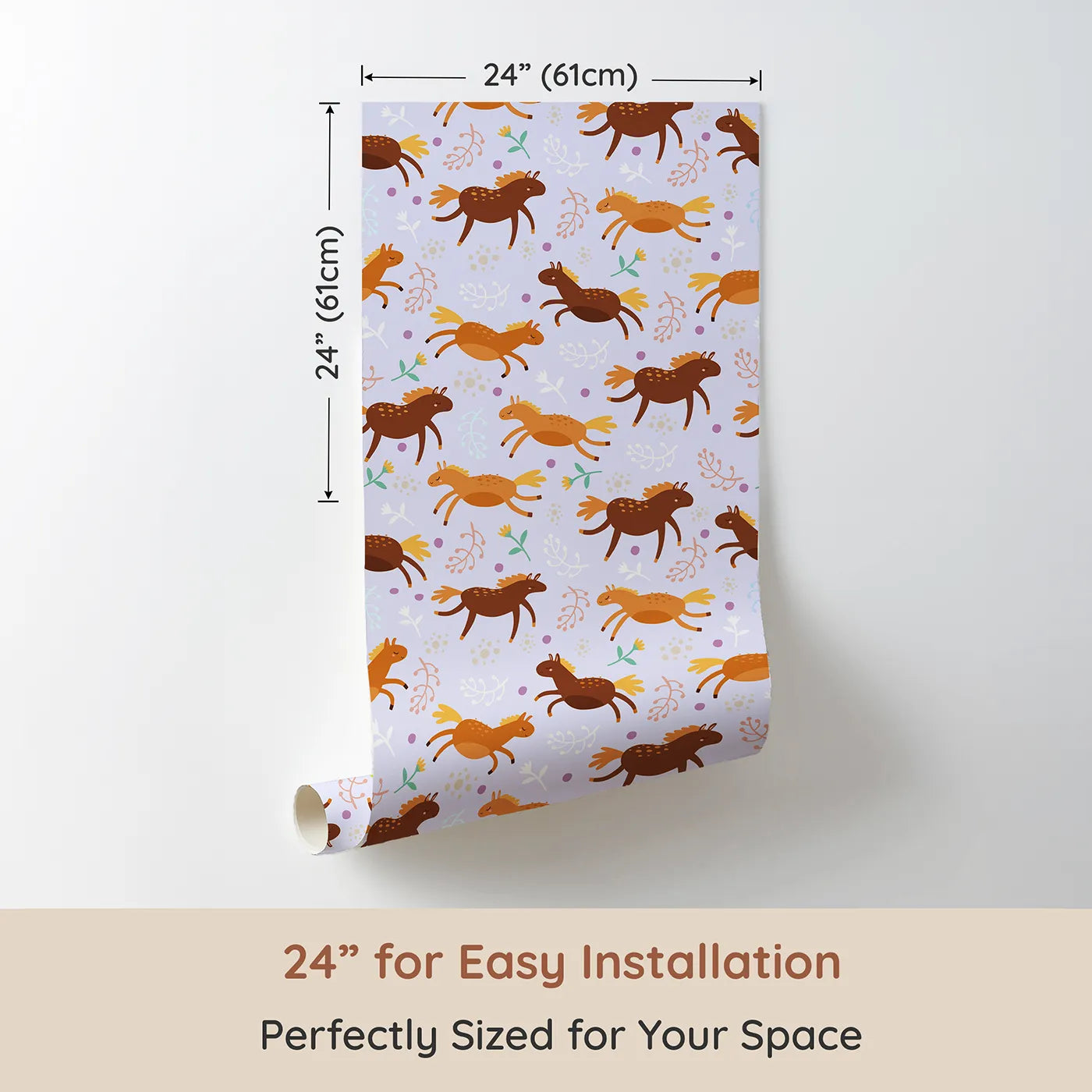 This sweet kids wallpaper features a whimsical pattern of ponies prancing through a meadow of delicate flowers and leaves. The dreamy lavender sky background makes this a magical choice for a nursery or bedroom, creating a special space that inspires fairytale adventures and imaginative play.