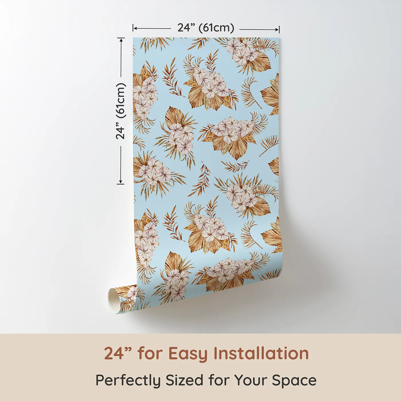Let them dream big in a room filled with calming, boho-inspired charm. This beautiful botanical wallpaper features bouquets of dried palm leaves, pampas grass, and soft blossoms, floating on a gentle sky-blue background. It’s a serene design perfect for a nursery or playroom.