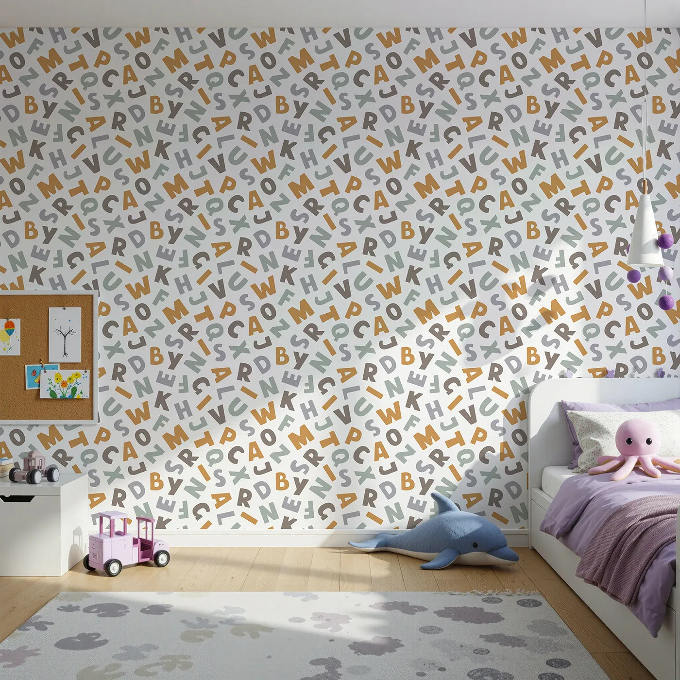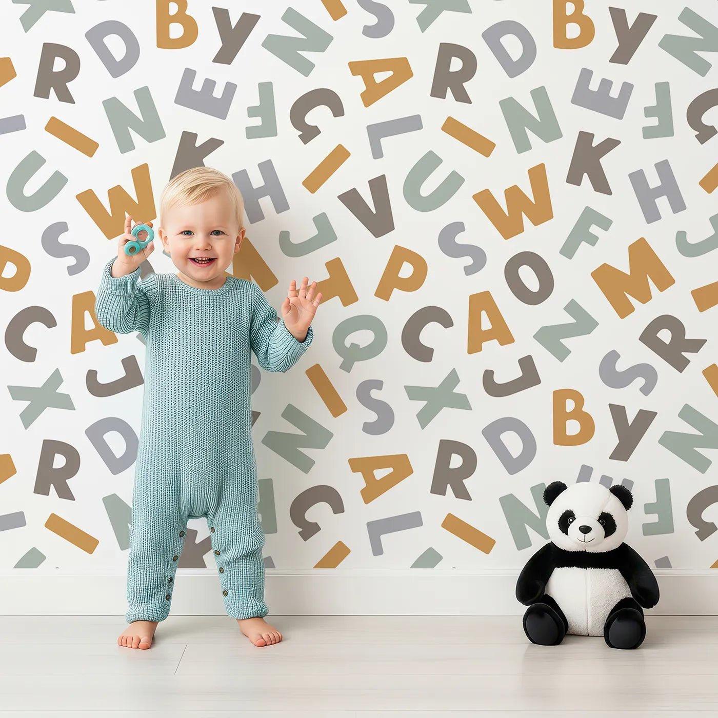 This beautiful nursery wallpaper makes learning the alphabet a stylish adventure. A playful scatter of letters in warm, earthy tones of mustard, green, and brown creates a modern and sophisticated look. Itβs a perfect gender-neutral design for a nursery or playroom that encourages early learning in a calm setting.