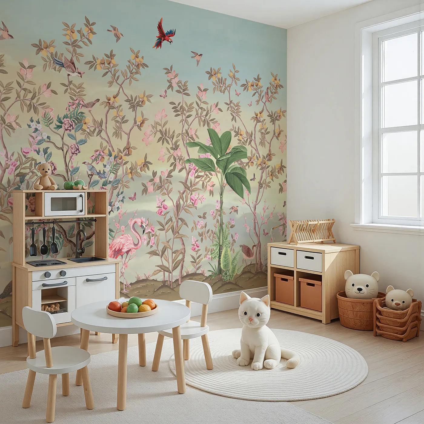 This stunning wall mural transforms any room into a vibrant, exotic garden. A beautiful collection of colorful and graceful birds play among the lush greenery and palm trees against a soft pink sky. The detailed, classic art style makes this a timeless and captivating scene.