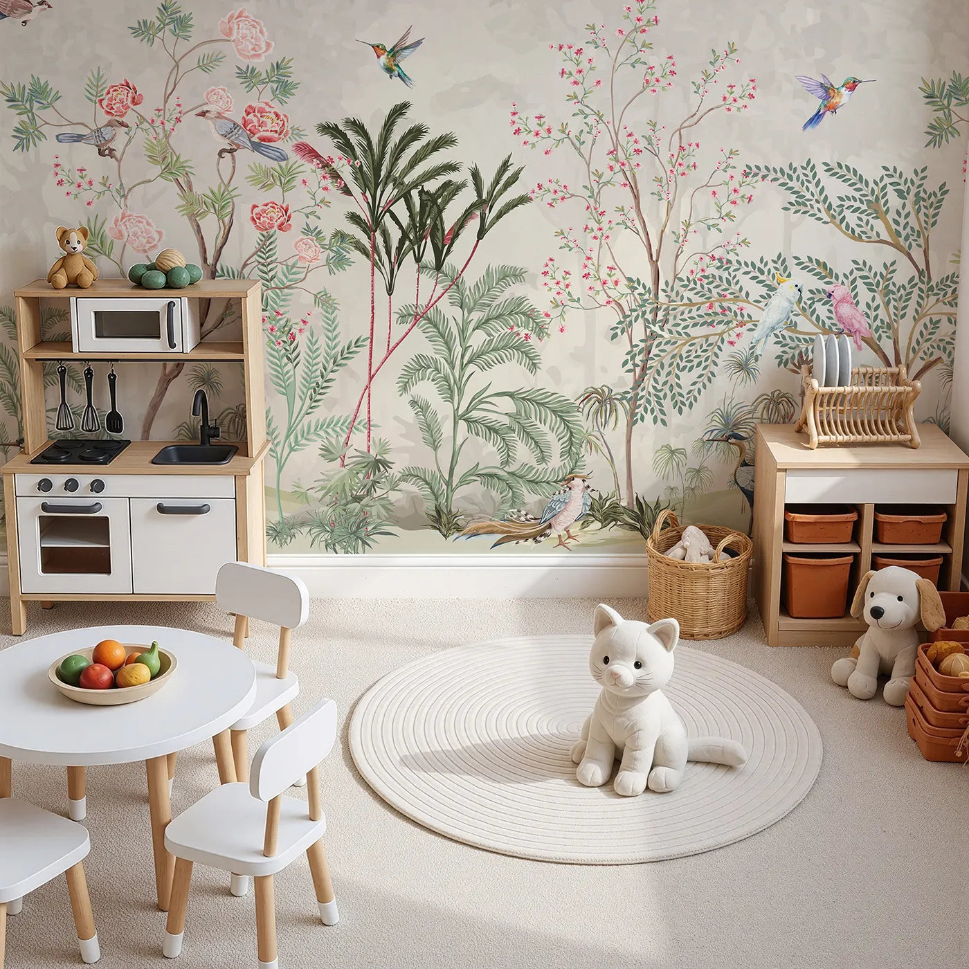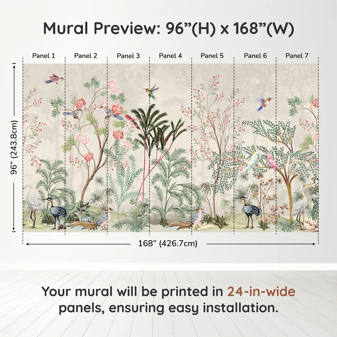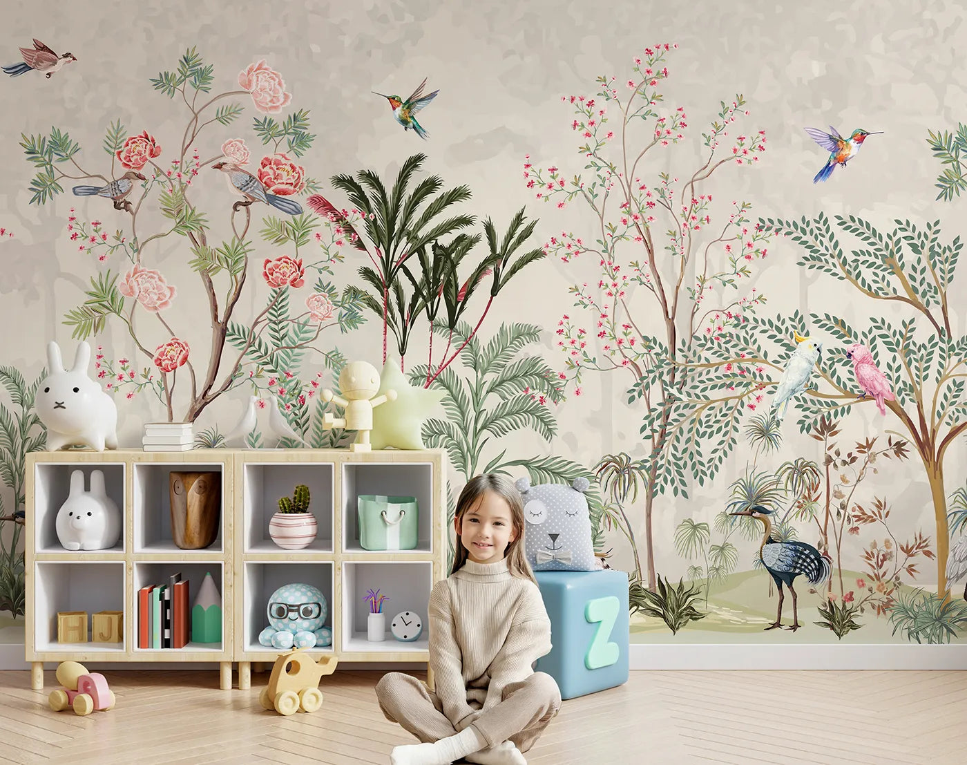 This stunning wall mural transforms any room into a vibrant, exotic garden. A beautiful collection of colorful and graceful birds play among the lush greenery and palm trees. The detailed, classic art style makes this a timeless and captivating scene for any age.