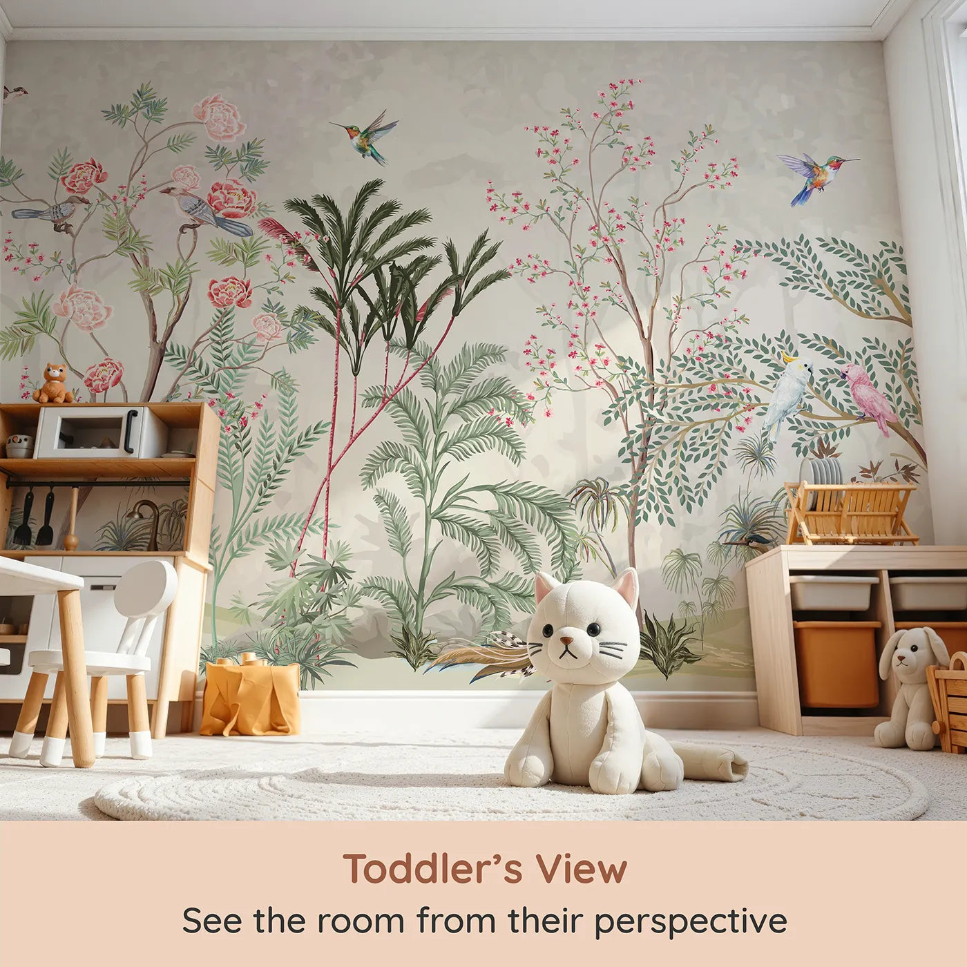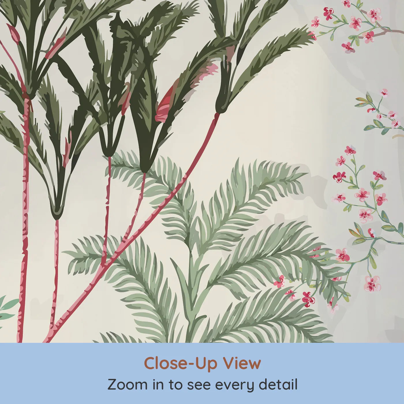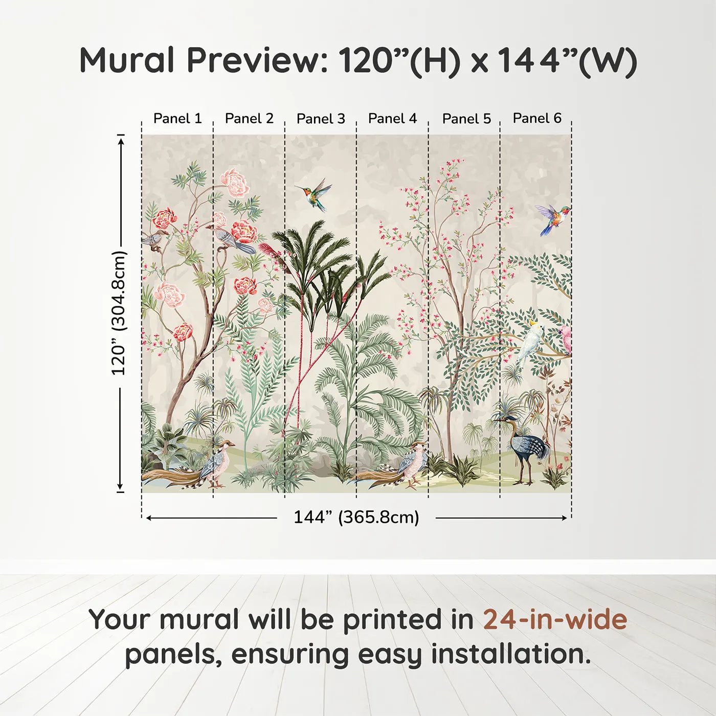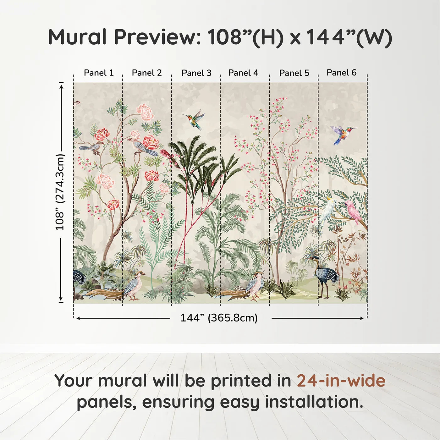 This stunning wall mural transforms any room into a vibrant, exotic garden. A beautiful collection of colorful and graceful birds play among the lush greenery and palm trees. The detailed, classic art style makes this a timeless and captivating scene for any age.