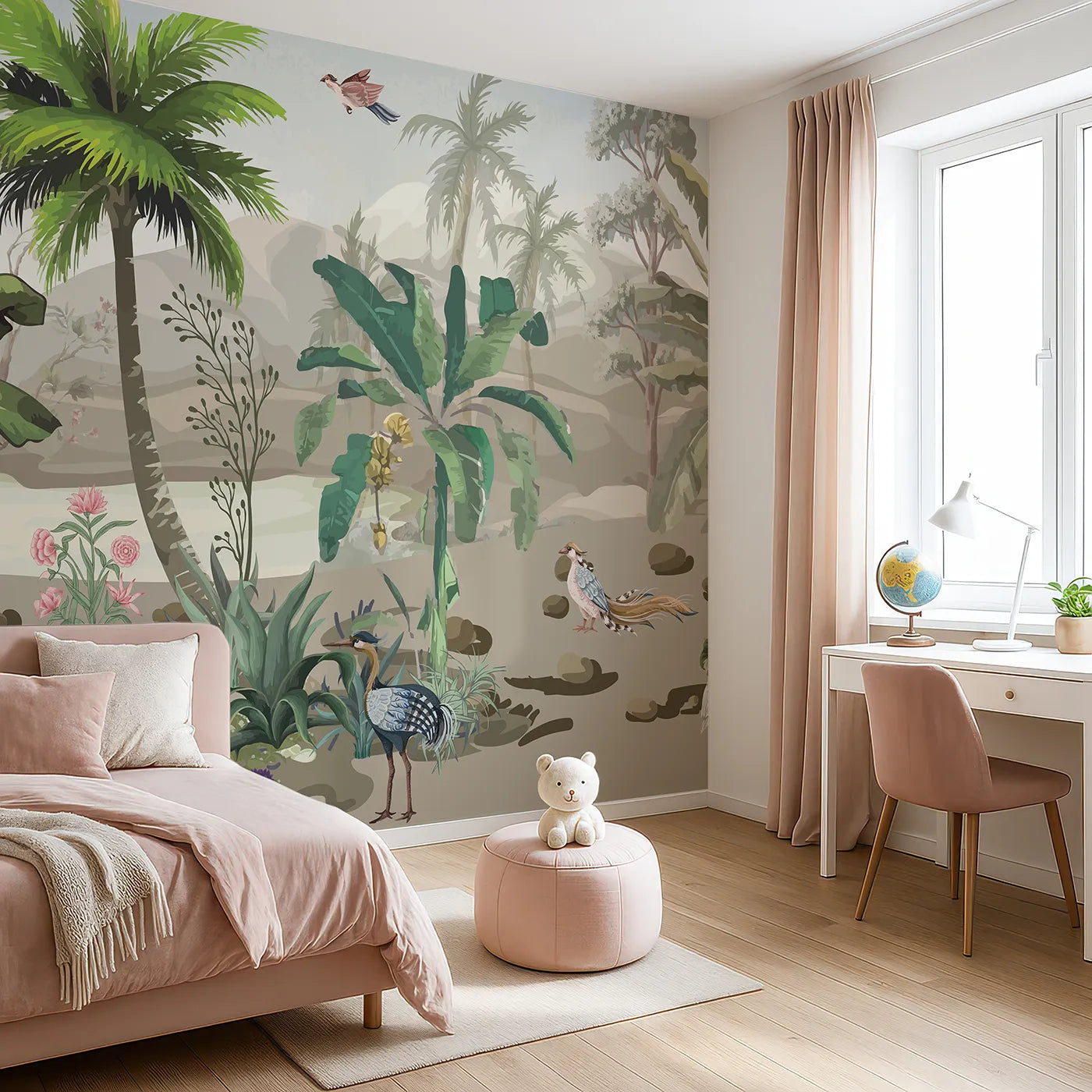 This beautiful wall mural features a serene gathering of exotic birds in a classic, illustrative style. The birds, with their detailed plumage, are perched among delicate trees and flowers, creating a sophisticated and calming sanctuary. It's a perfect choice for a timeless nursery.
