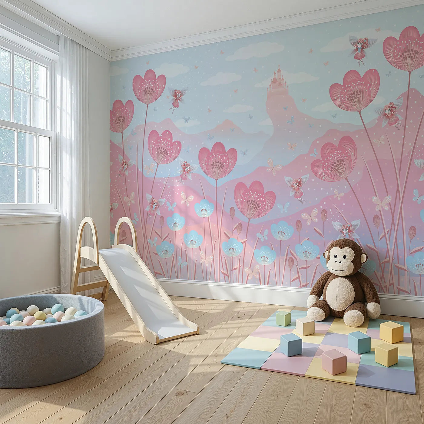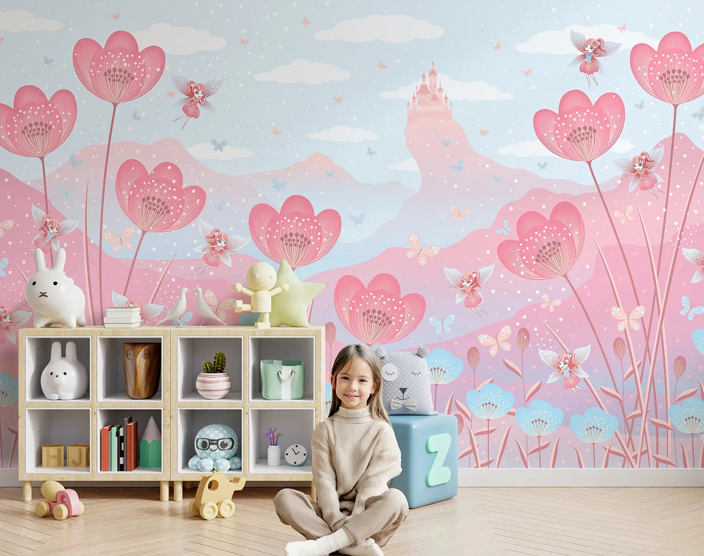 This charming and imaginative wall mural features a magical meadow of large, stylized flowers in dreamy shades of pink and blue. Tiny, playful fairies and butterflies flit between the blossoms against a backdrop of mountains and a fairytale castle, creating a scene of pure enchantment.