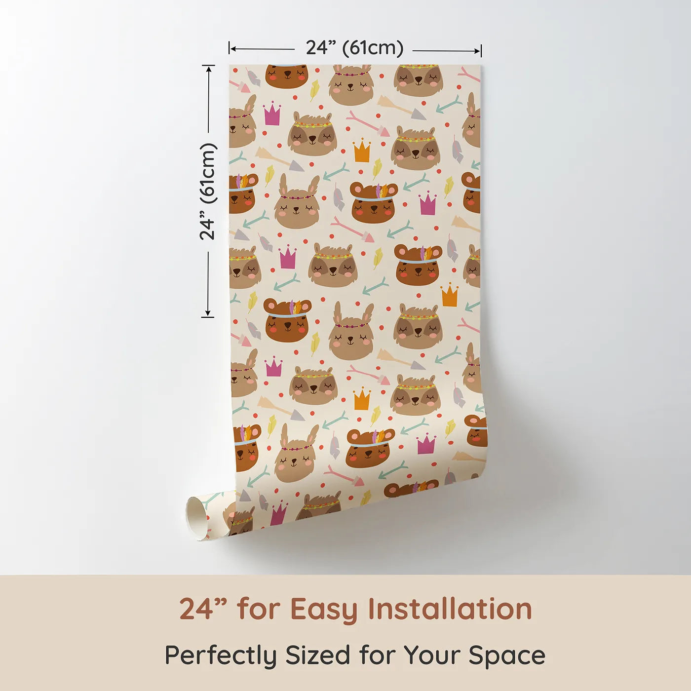 This charming animal wallpaper features a pattern of sweet, sleepy woodland critters like bears and bunnies wearing playful feather crowns. Set against a warm beige background with arrows and dots, this design brings a gentle, boho-inspired feel to any nursery or playroom, sparking imagination and sweet dreams.