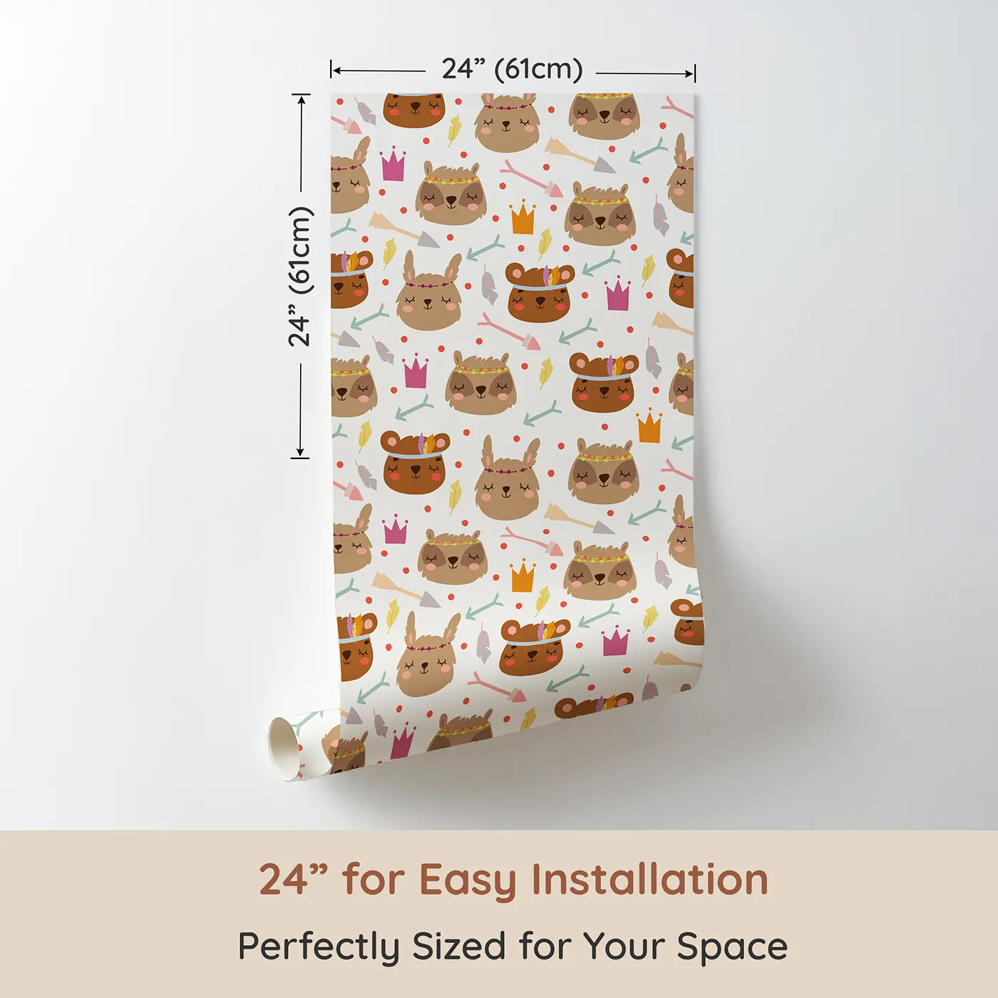 This charming animal wallpaper features a pattern of sweet, sleepy woodland critters like bears and bunnies wearing playful feather crowns. Set against a clean cream white background with arrows and dots, this design brings a gentle, boho-inspired feel to any nursery or playroom, sparking imagination and sweet dreams.