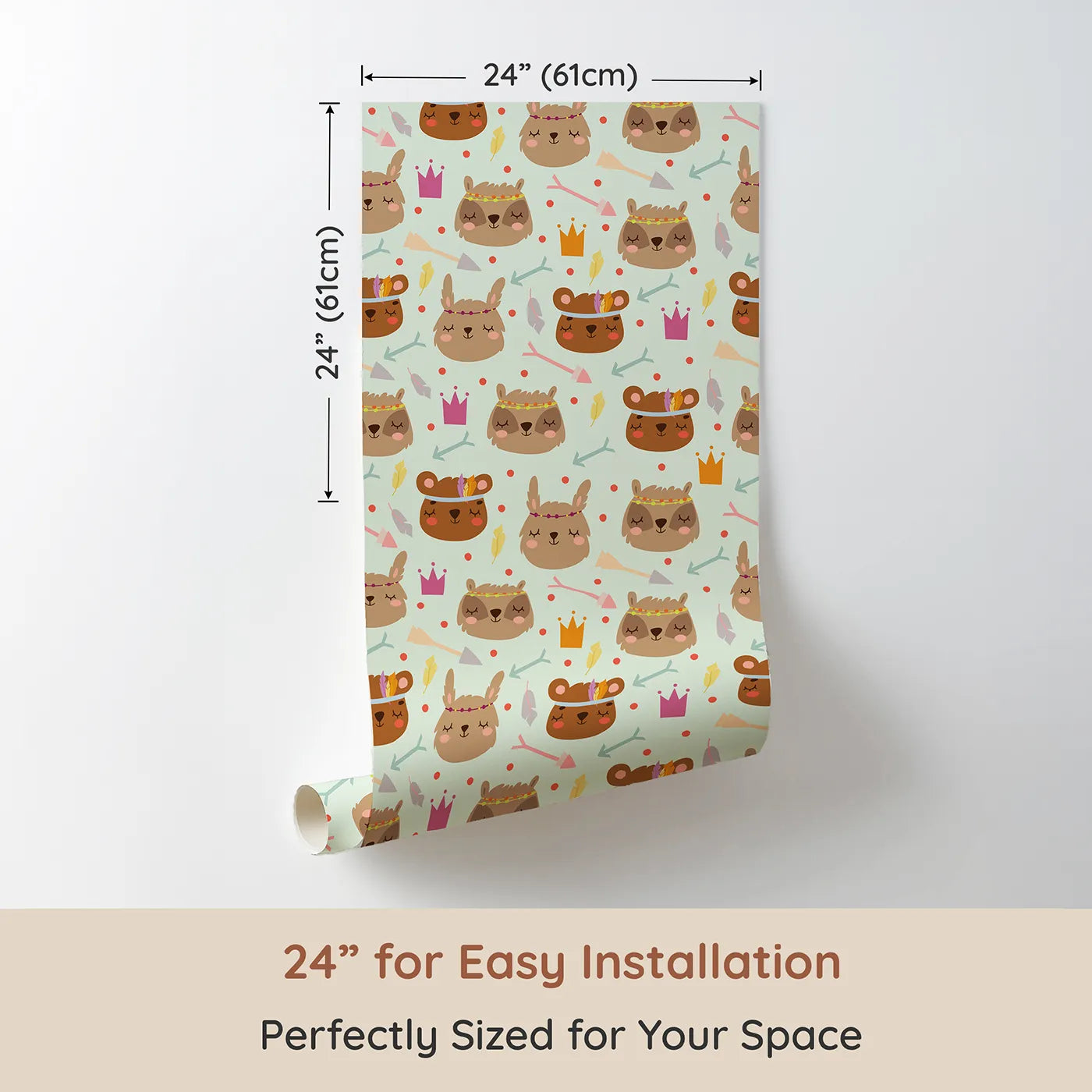 This charming animal wallpaper features a pattern of sweet, sleepy woodland critters like bears and bunnies wearing playful feather crowns. Set against a calm meadow green background with arrows and dots, this design brings a gentle, boho-inspired feel to any nursery or playroom, sparking imagination and sweet dreams.