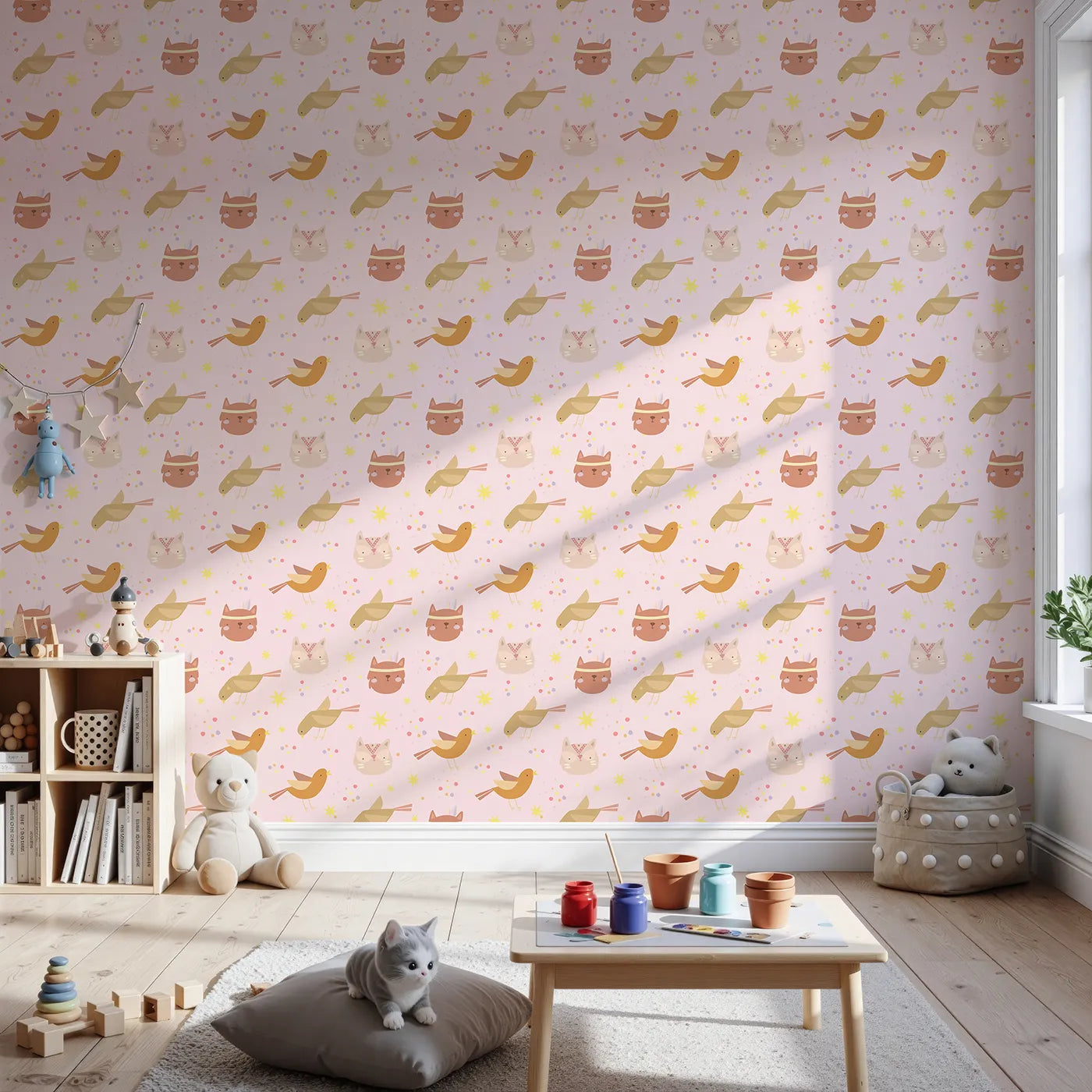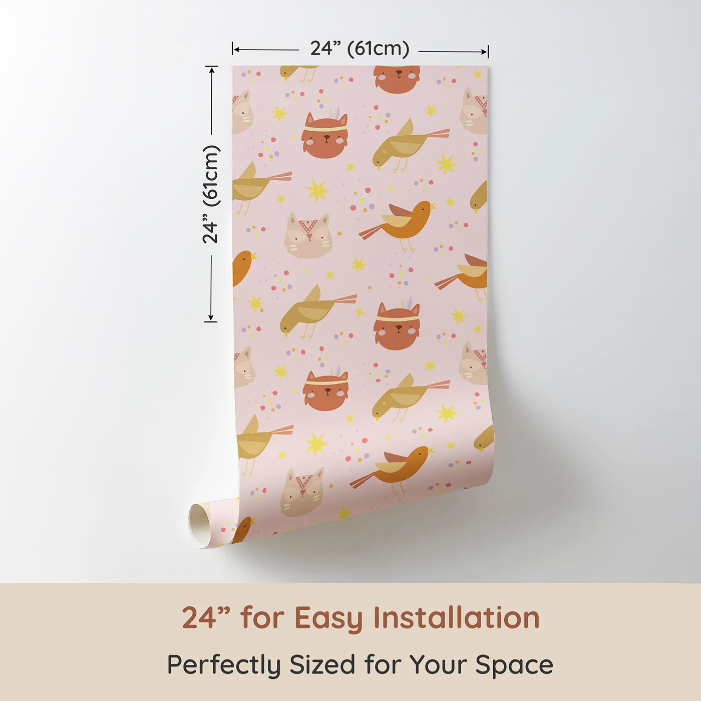 This charming kids wallpaper is filled with a delightful mix of friendly animal faces and birds with a touch of boho style. The soft blush background makes the cute characters pop, creating a fun and engaging atmosphere for a nursery or playroom. It's a sweet celebration of feathered and fuzzy friends.