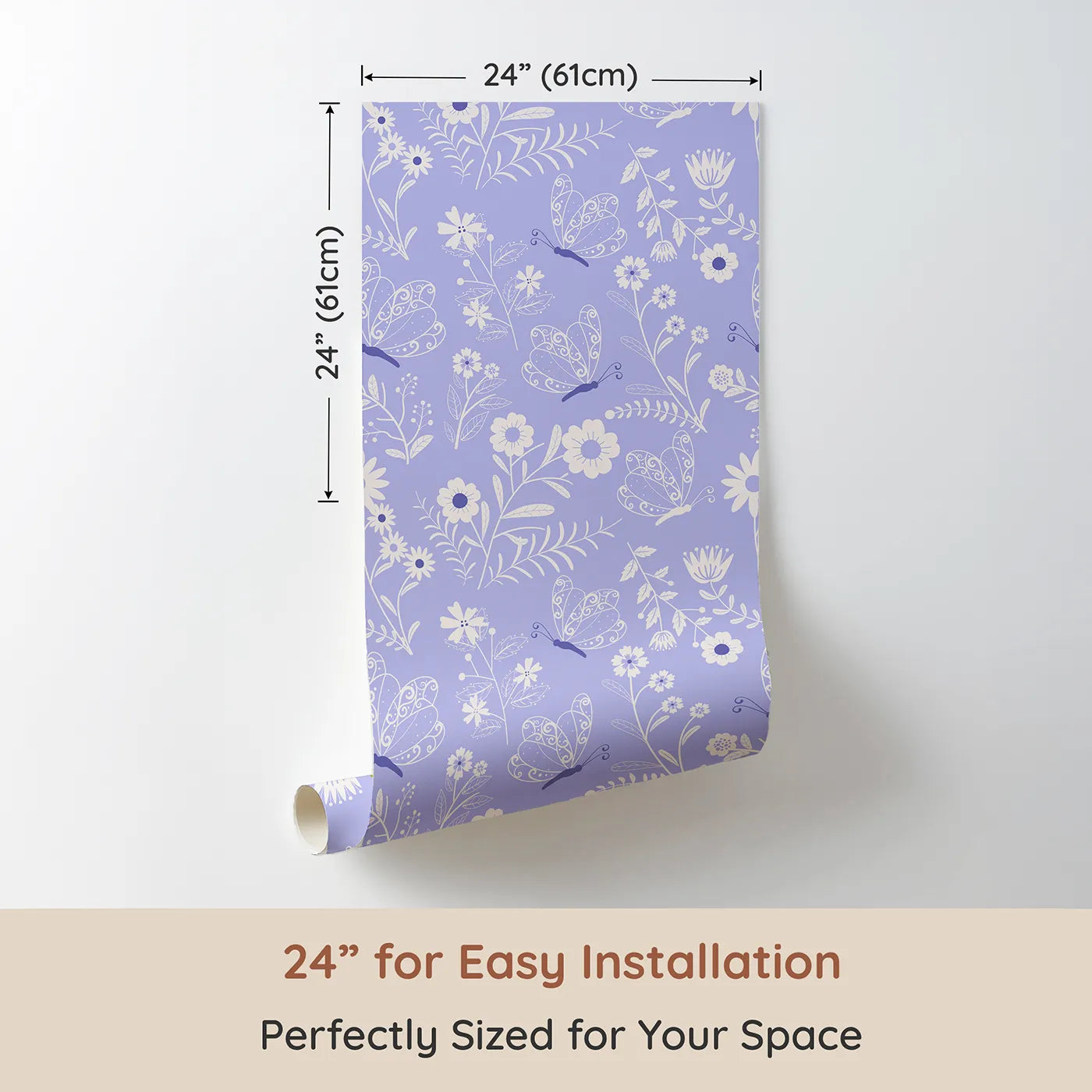 This beautiful girls wallpaper features a pattern of elegant white butterflies and florals against a soft lavender mist background. The dreamy color creates a magical atmosphere, perfect for a nursery or bedroom that inspires sweet dreams and fairy tales.