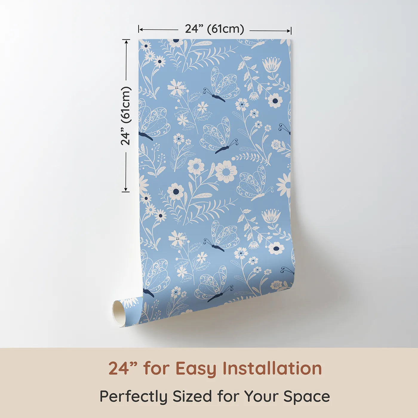 This charming kids wallpaper features a pattern of beautifully detailed butterflies and botanical sprigs against a calm powder blue background. The soothing color palette and elegant design create a peaceful atmosphere, perfect for a nursery, bedroom, or quiet reading corner.