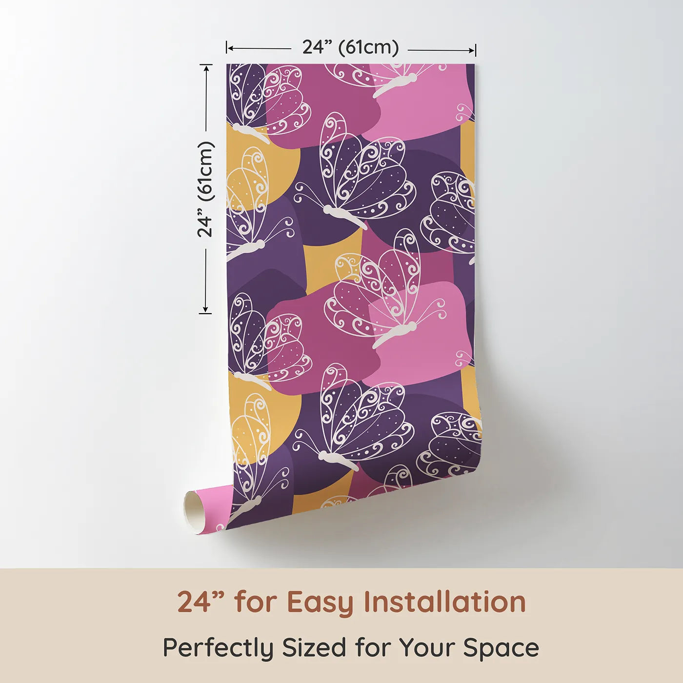 This whimsical kids wallpaper features a vibrant pattern of beautiful butterflies in a mix of purple, pink, and yellow. The abstract, colorful background adds to the playful and energetic feel of the design, making it a perfect choice for a playroom or bedroom that inspires creativity and fun.