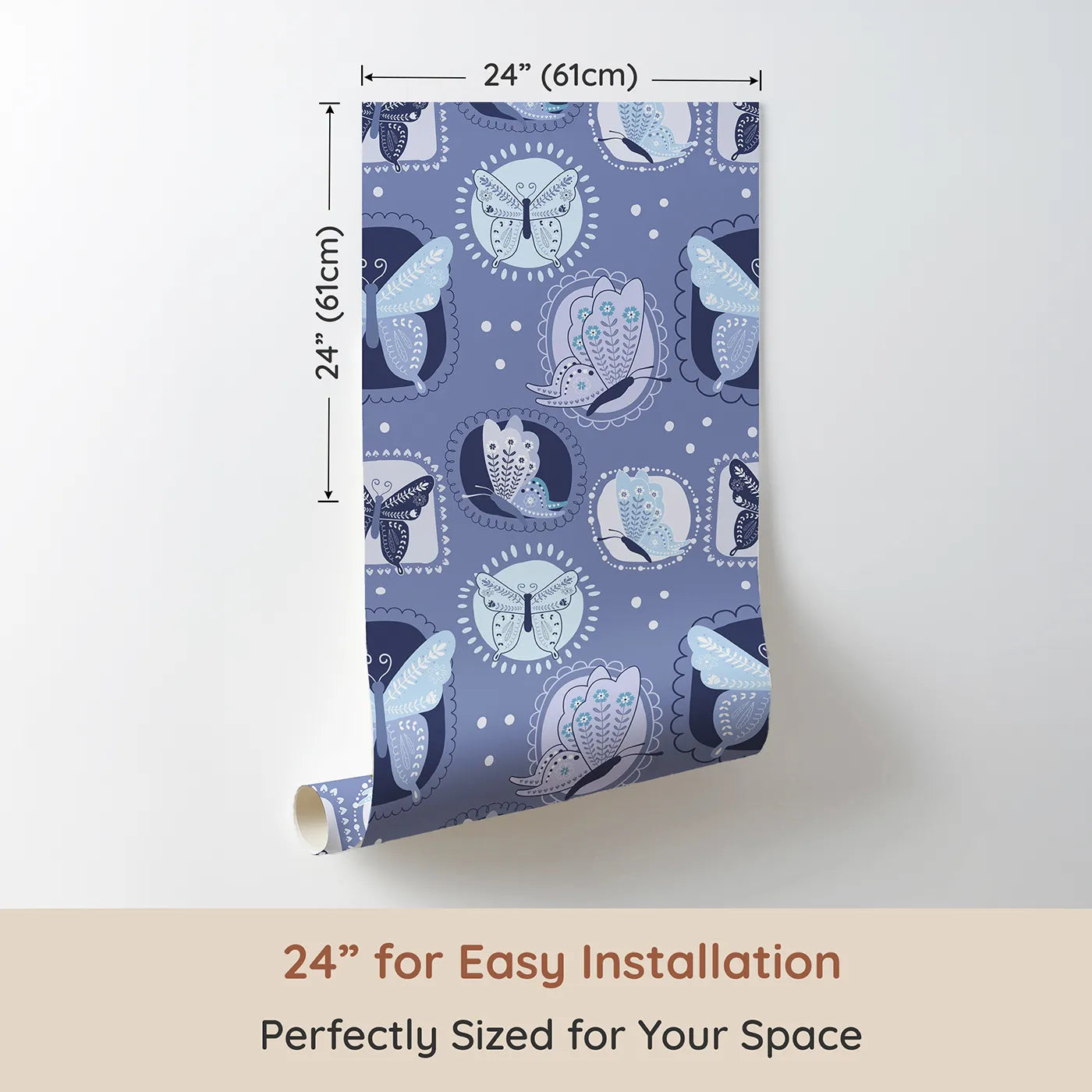 This striking kids wallpaper features a captivating pattern of folk-art style butterflies and botanicals in white line art against a deep indigo blue background. The dramatic and imaginative design creates a feeling of a magical midnight garden, perfect for a room that sparks creativity and wonder.