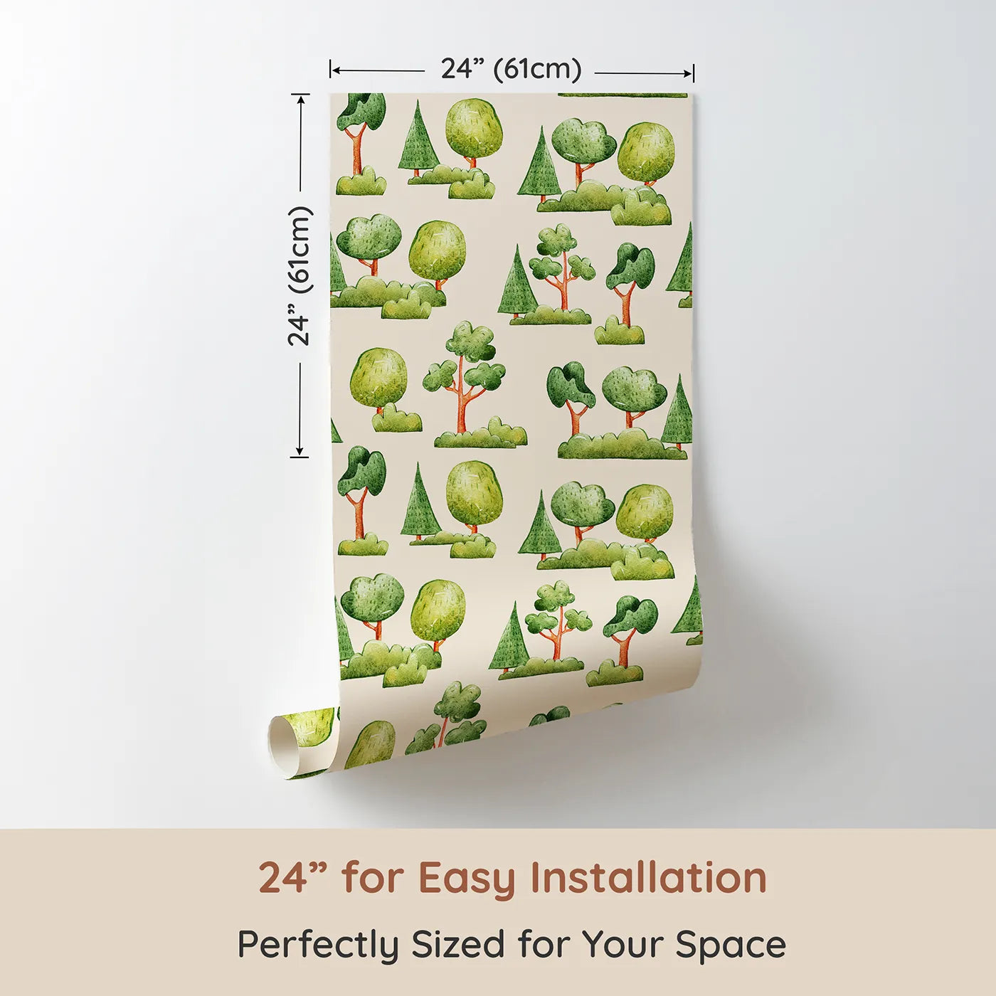 Create a cozy and playful backdrop with this charming woodland wallpaper. Stylized watercolor trees and lush green bushes are scattered across a warm cream-colored background. This gender-neutral wallpaper is perfect for sparking imaginative playtime and sweet dreams.