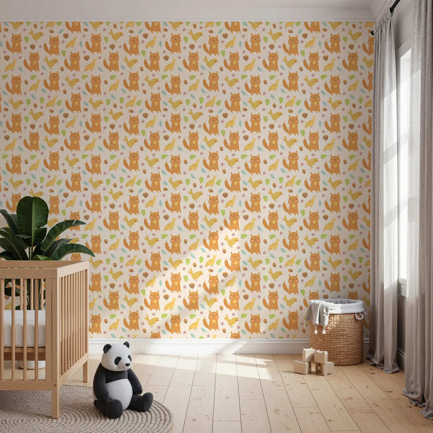 This charming woodland wallpaper features a delightful pattern of sweet foxes and cheerful yellow birds. Scattered leaves and acorns on a warm sandstone background add to the nature-inspired feel, creating a cozy and playful backdrop for a gender-neutral nursery.