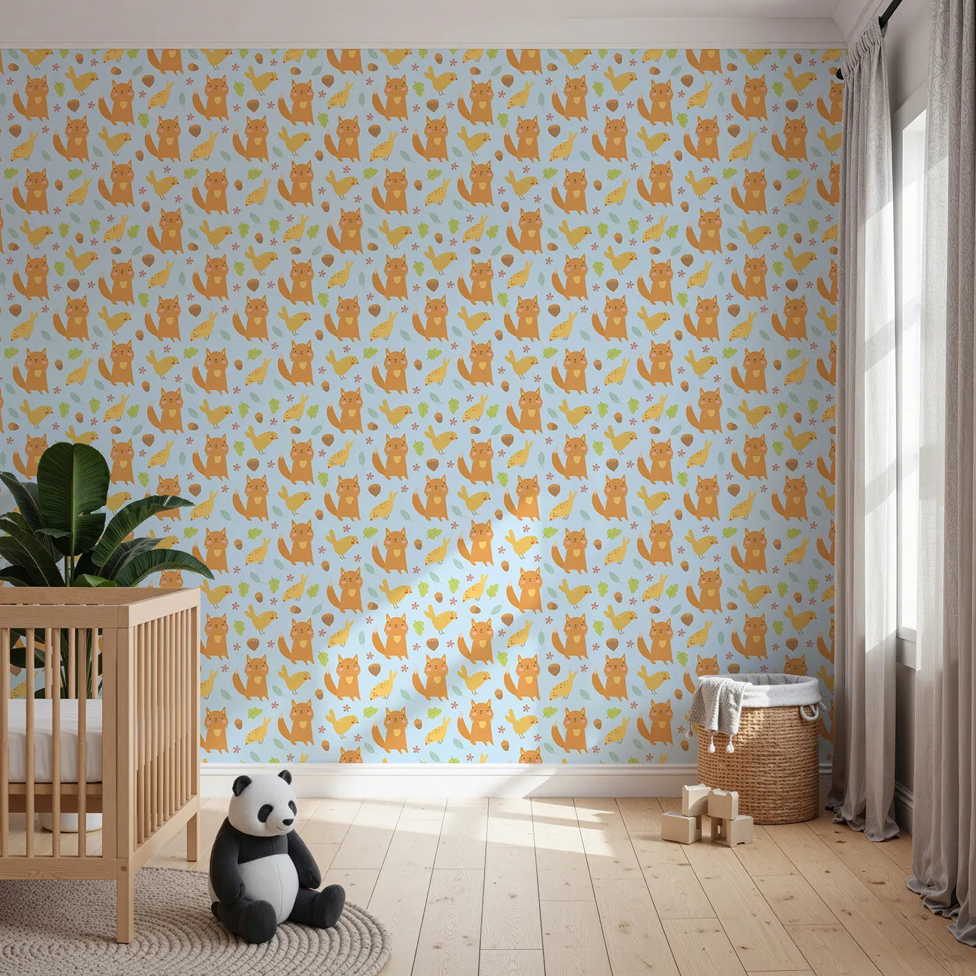 This charming woodland wallpaper features a delightful pattern of sweet foxes and cheerful yellow birds. Scattered leaves and acorns on a serene sky blue background add to the nature-inspired feel, creating a bright and playful backdrop for any child's room.