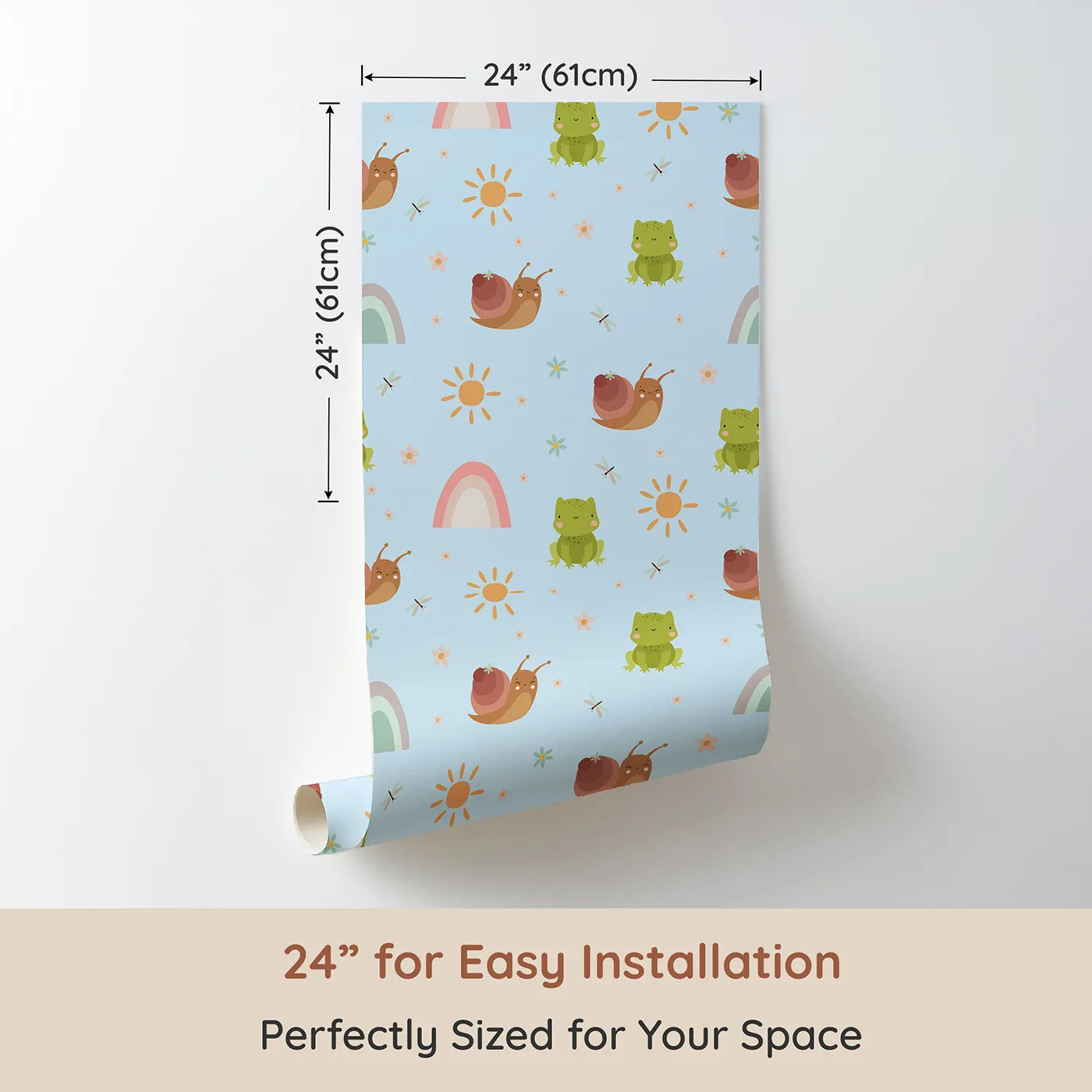 This charming kids wallpaper captures a happy day in the garden with cute frogs, snails, dragonflies, and rainbows. The cheerful pattern on a sky blue background creates a bright and playful space, perfect for a gender-neutral nursery or a fun playroom that encourages stories about nature's little friends.