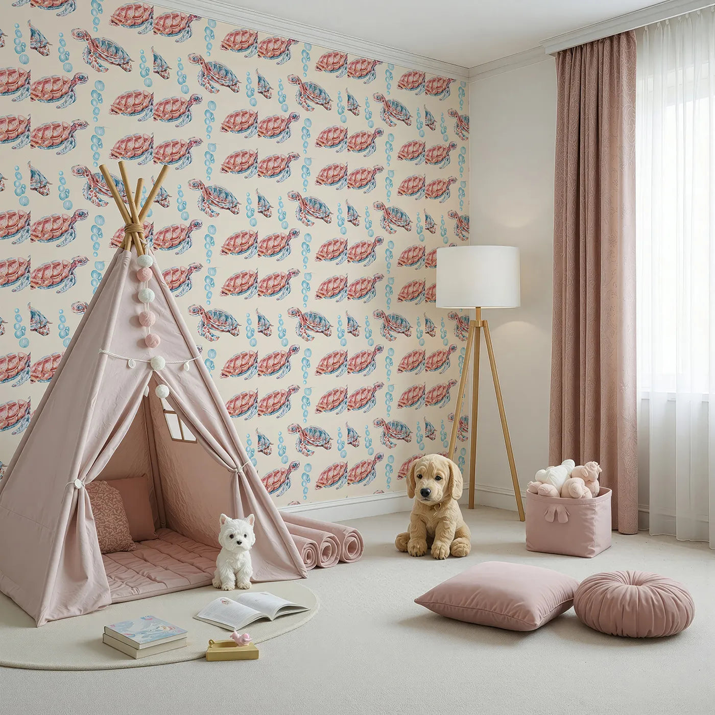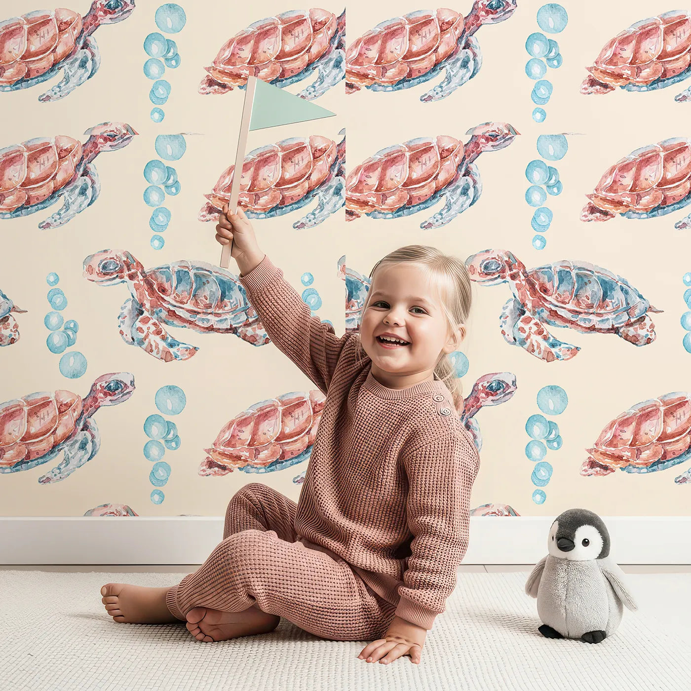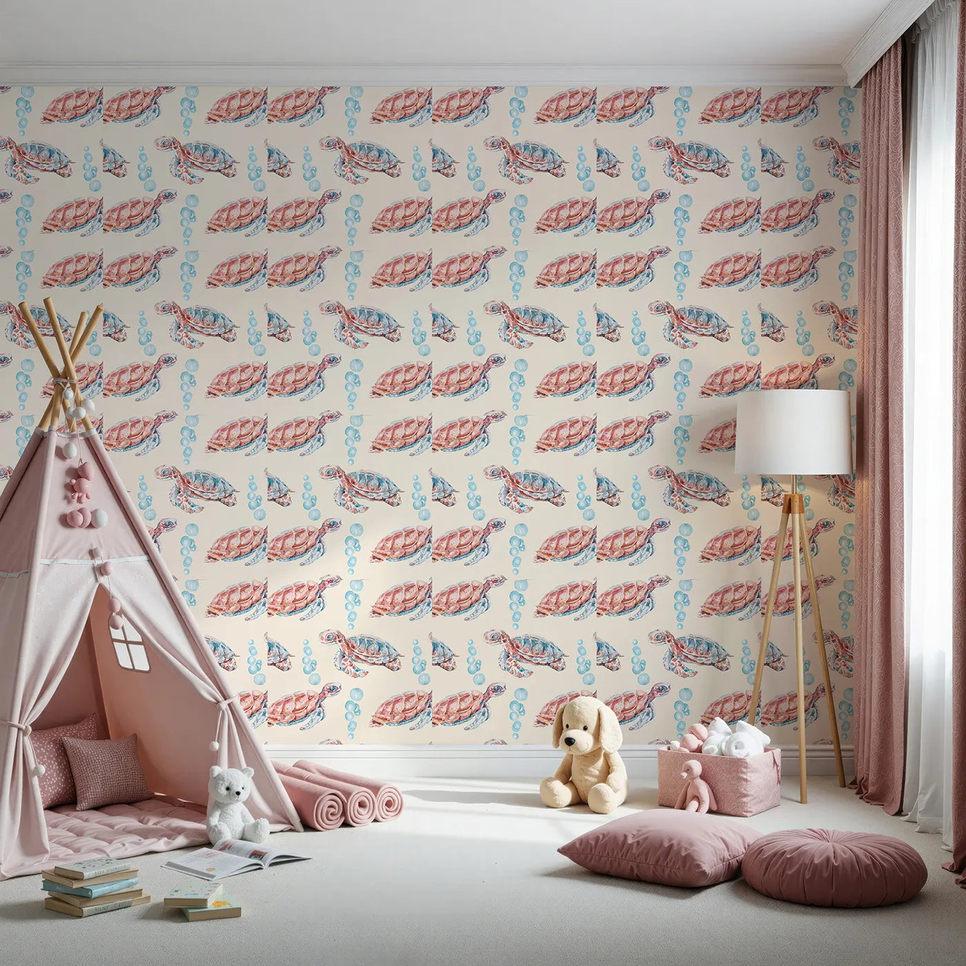 For a room that feels both modern and reassuring, this ocean wallpaper showcases a pattern of little watercolor sea turtles on a warm beige background. Its simple, Scandinavian-inspired design is perfect for a calm and gender-neutral nursery or bathroom.