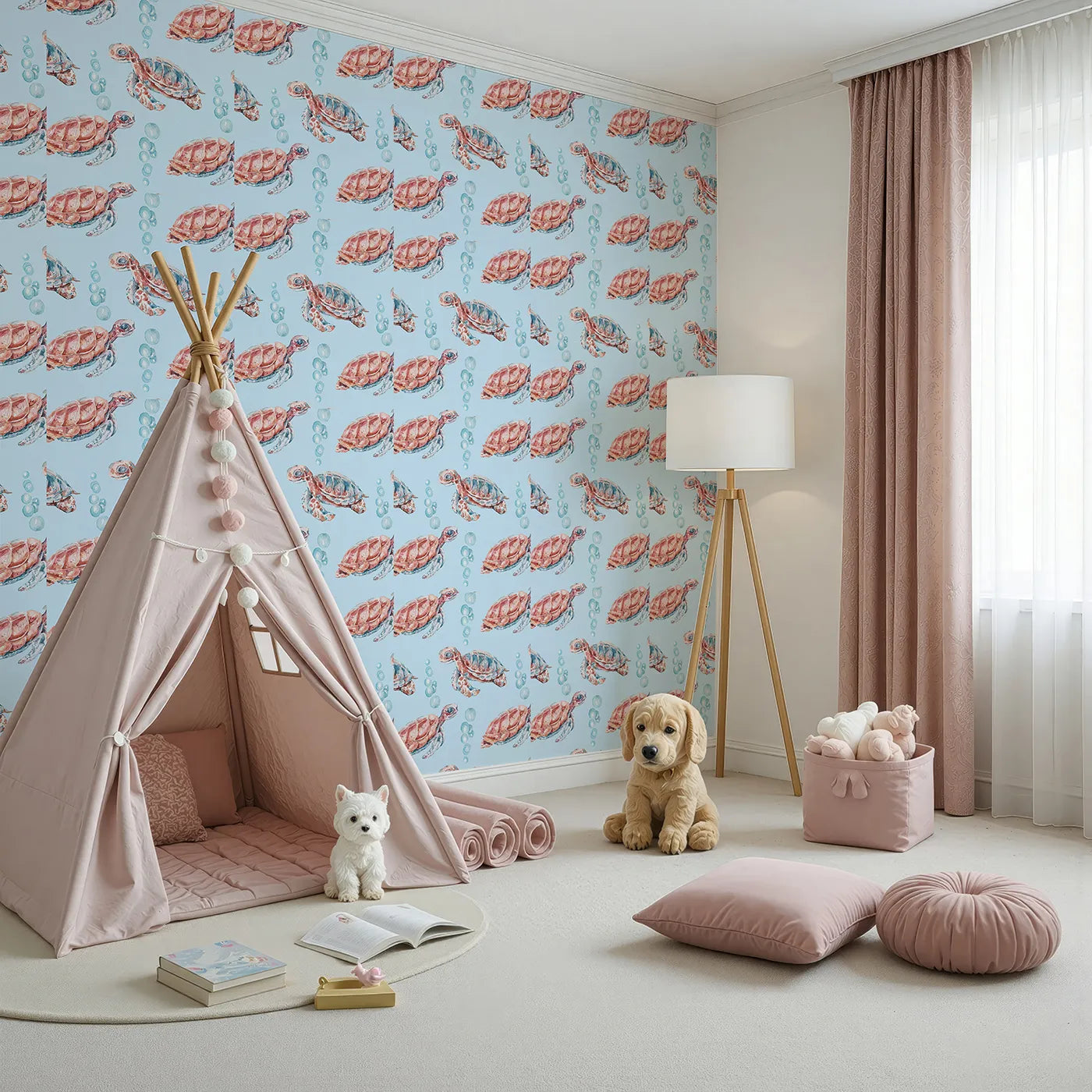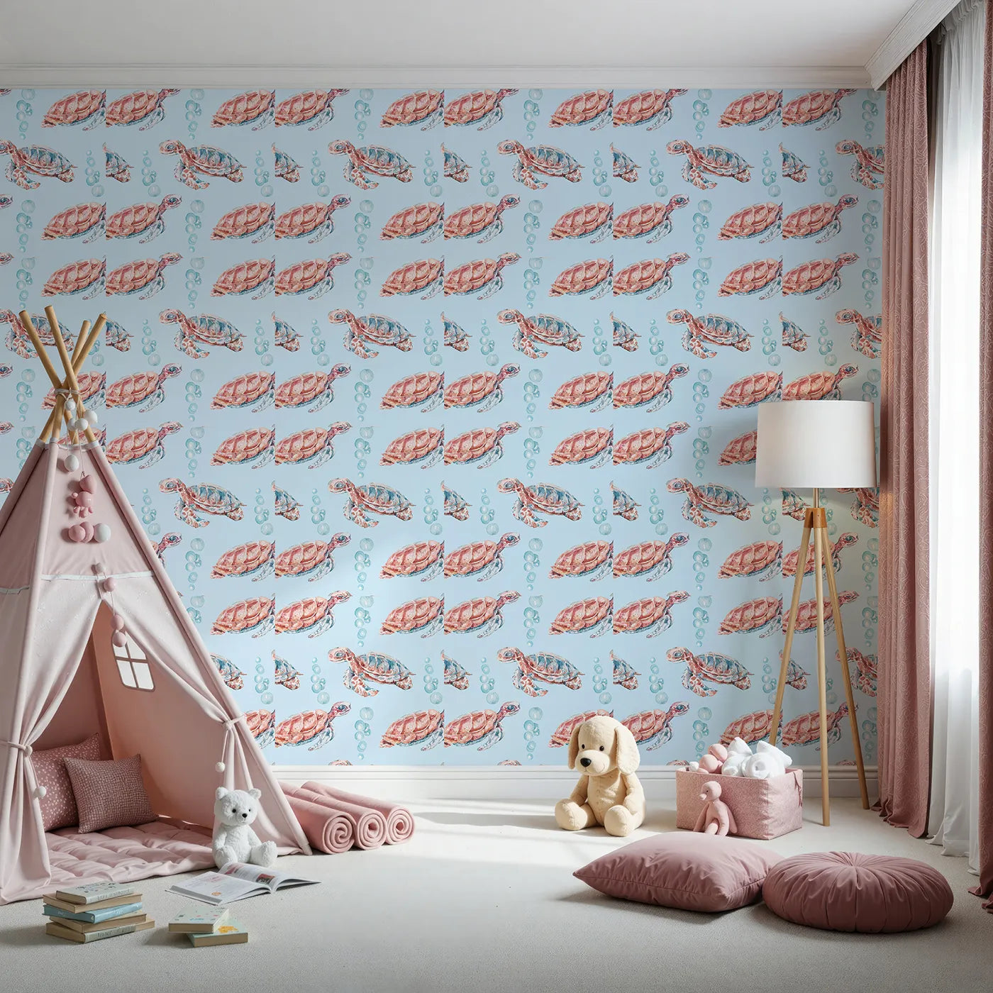 Let them drift off to sleep surrounded by the calming magic of this ocean wallpaper. A school of sweet watercolor sea turtles swims across a peaceful sky-blue background with fizzy bubbles, creating a serene and imaginative scene that feels both modern and sweet.