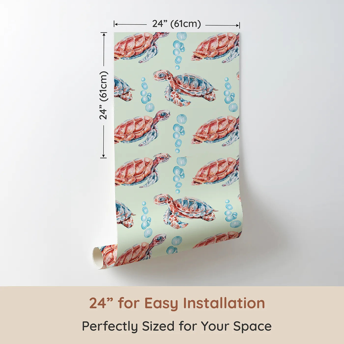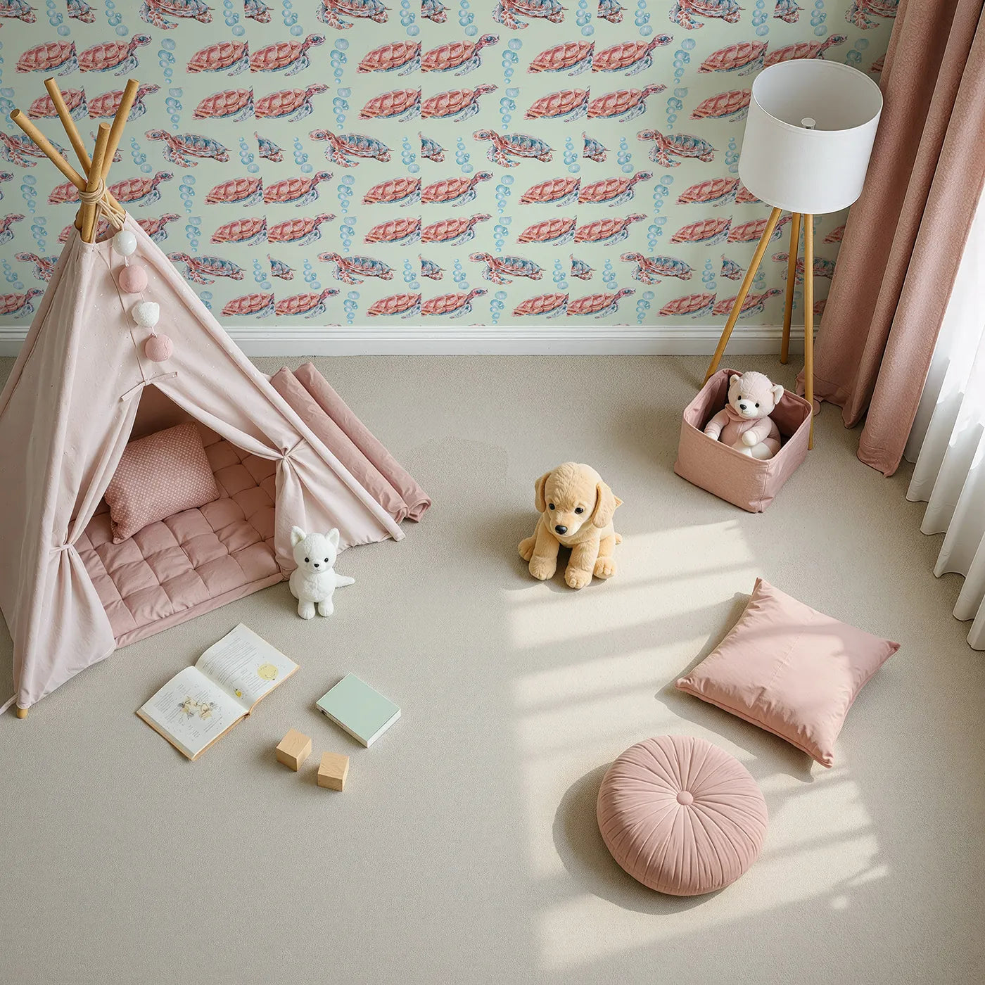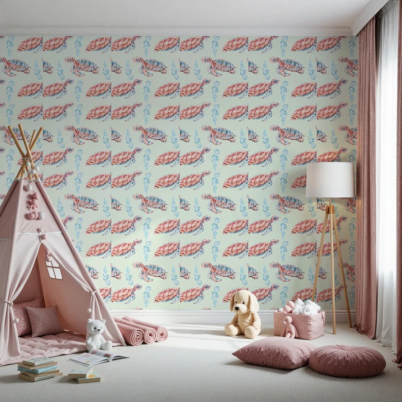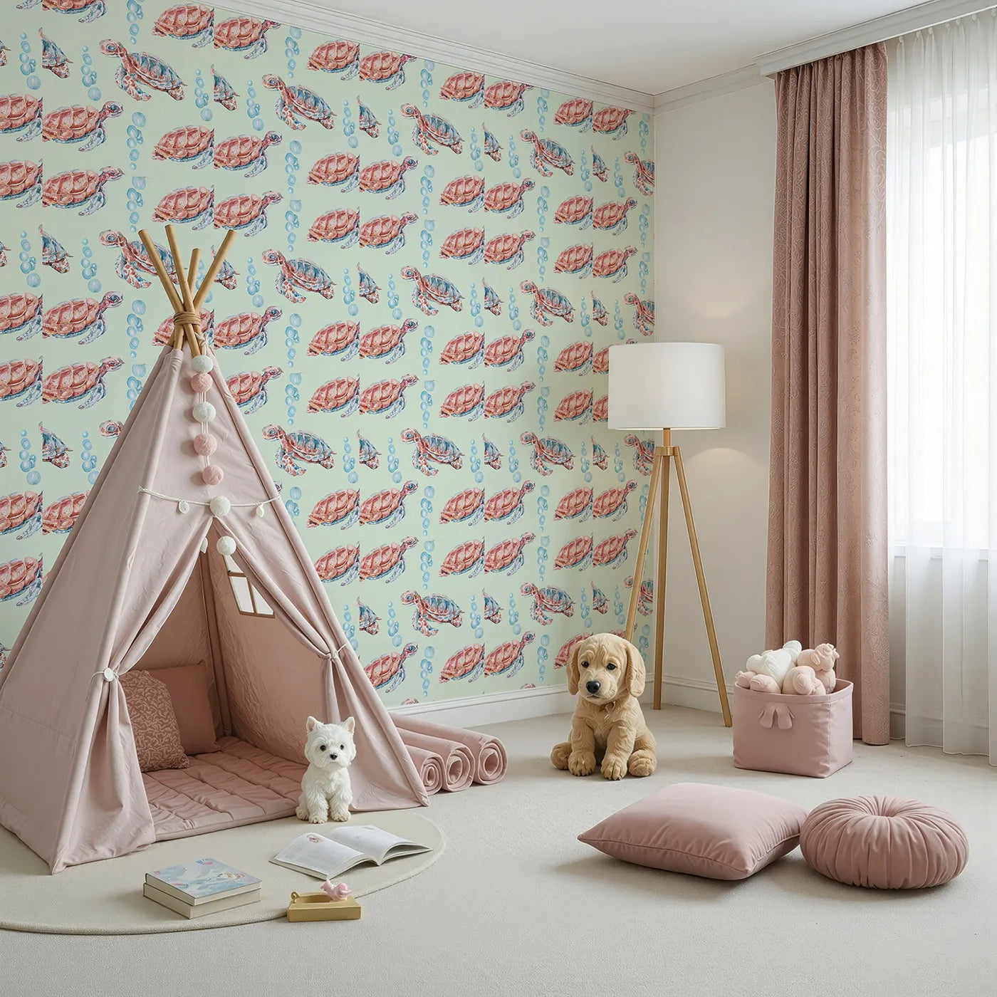 This charming nursery wallpaper features a playful pattern of little sea turtles against a refreshing mint background. The modern, minimalist design brings a fun yet calming feel to any child's room, creating a perfect space for imaginative underwater adventures.