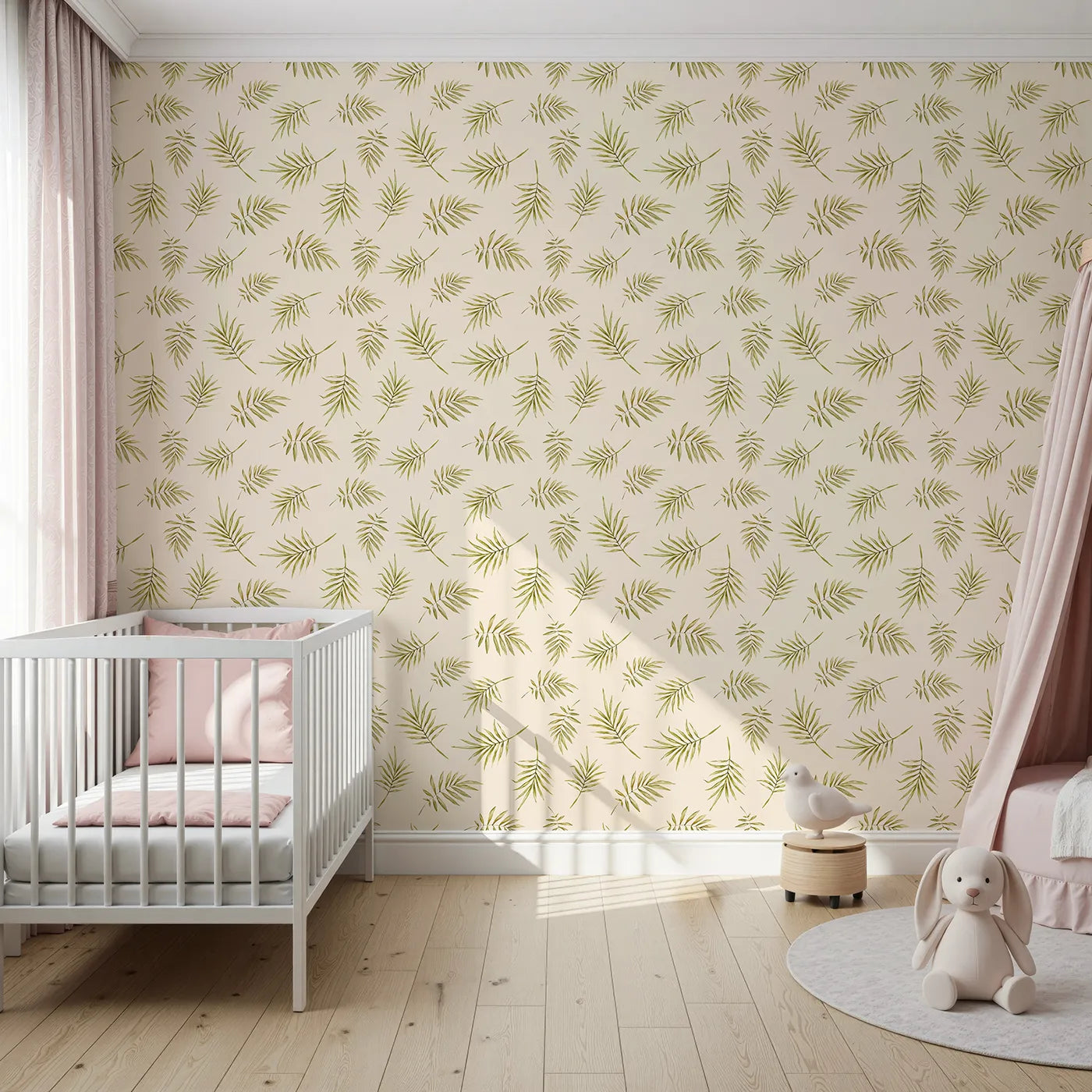 This beautiful botanical wallpaper brings a subtle touch of the tropics to your child's room. On a warm cream background, delicate watercolor palm leaves are scattered gracefully, creating a light and airy atmosphere. The minimalist design is perfect for a modern, gender-neutral nursery or a calming playroom space.