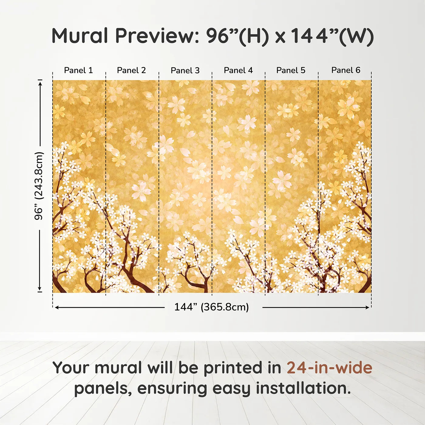 This beautiful floral wall mural features branches of delicate white cherry blossoms against a warm, golden-yellow background. The classic, Asian-inspired art style creates a serene and peaceful atmosphere, perfect for a calming nursery or a sophisticated child's room. Falling petals add to the gentle, magical mood.