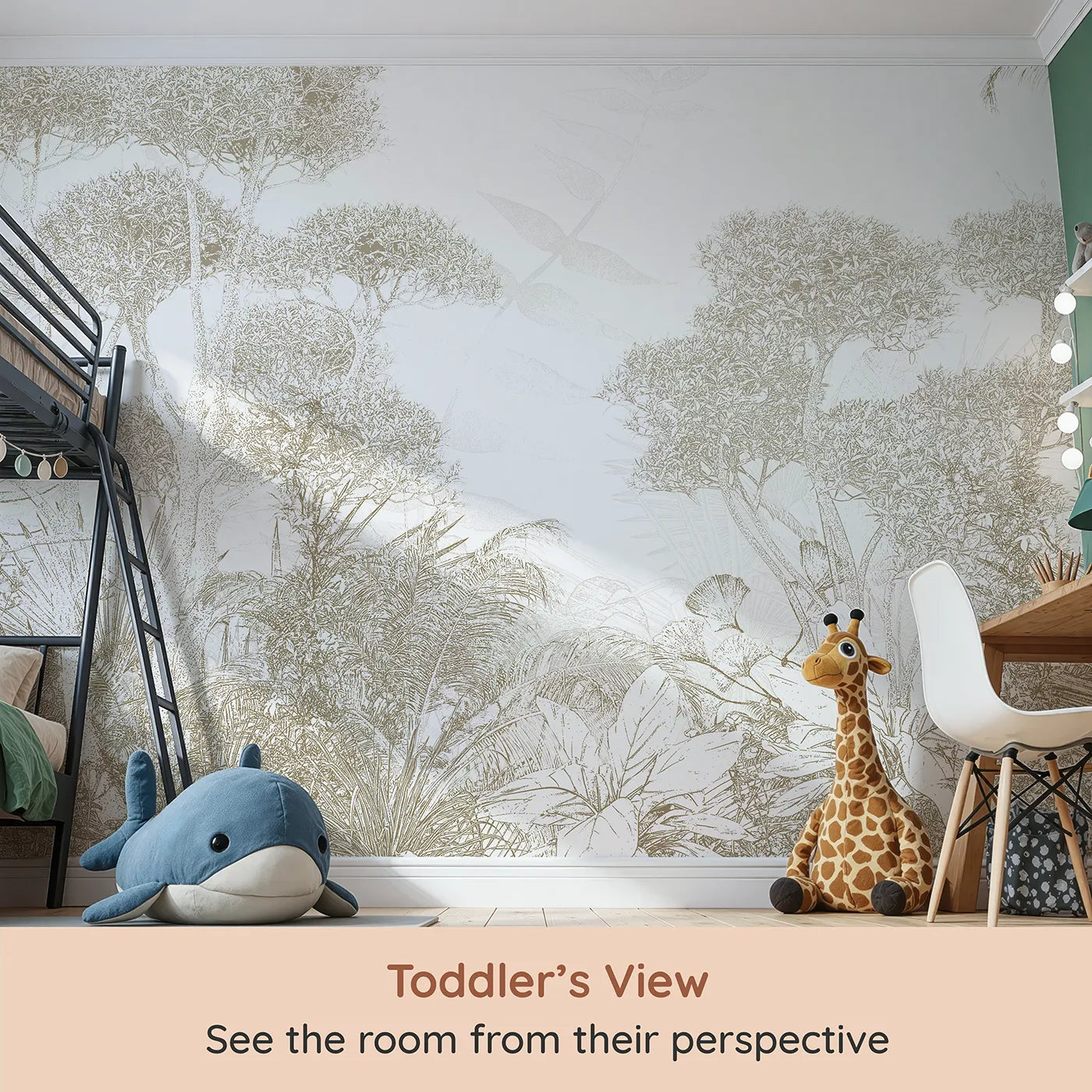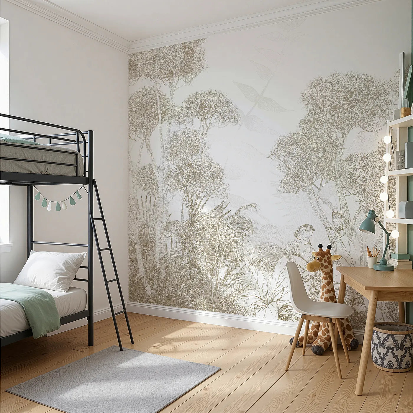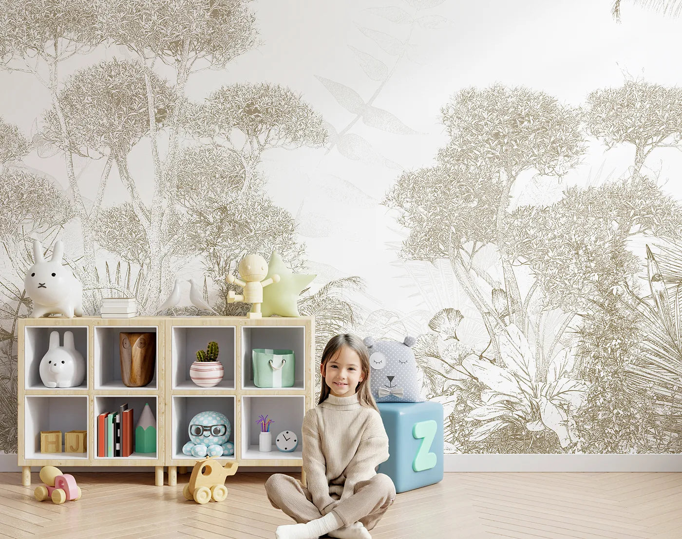 This charming botanical wallpaper brings a touch of nature's elegance to any child's room. The fine, golden-beige line drawings of trees and flowers create a dreamy, sophisticated look that feels both modern and timeless. It's a perfect, calming backdrop for a nursery.
